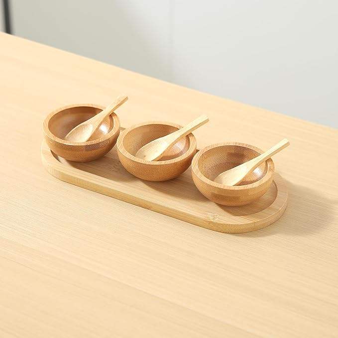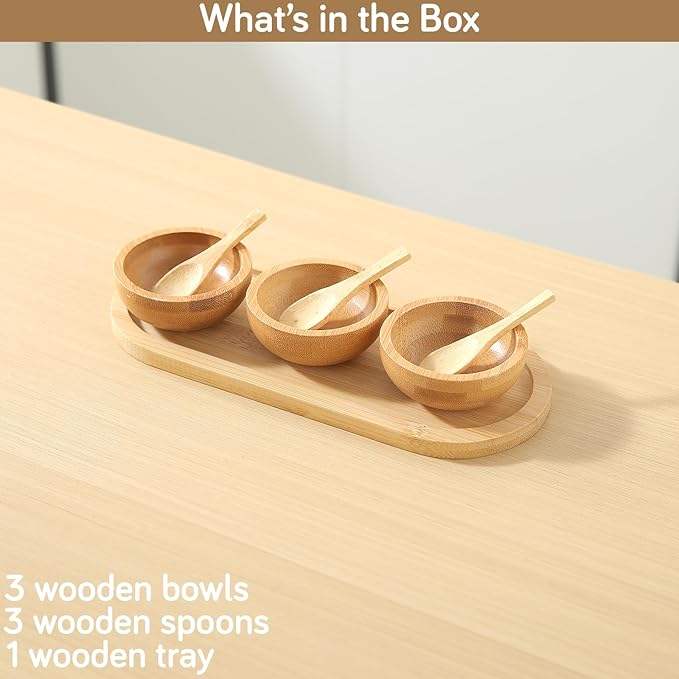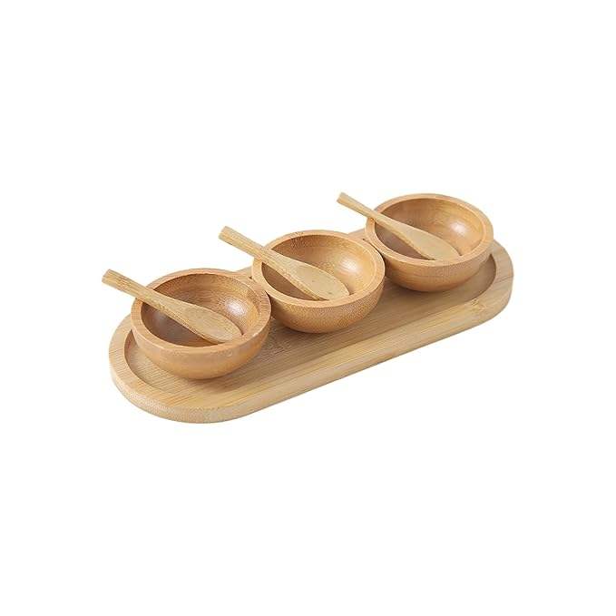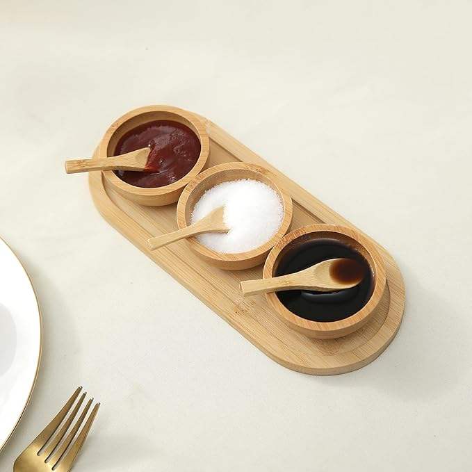 ชุดชามเครื่องปรุงอาหารไม้3ชิ้นพร้อมถาดและช้อนชามจุ่มไม้ธรรมชาติสำหรับโต๊ะอาหารและเครื่องเทศ