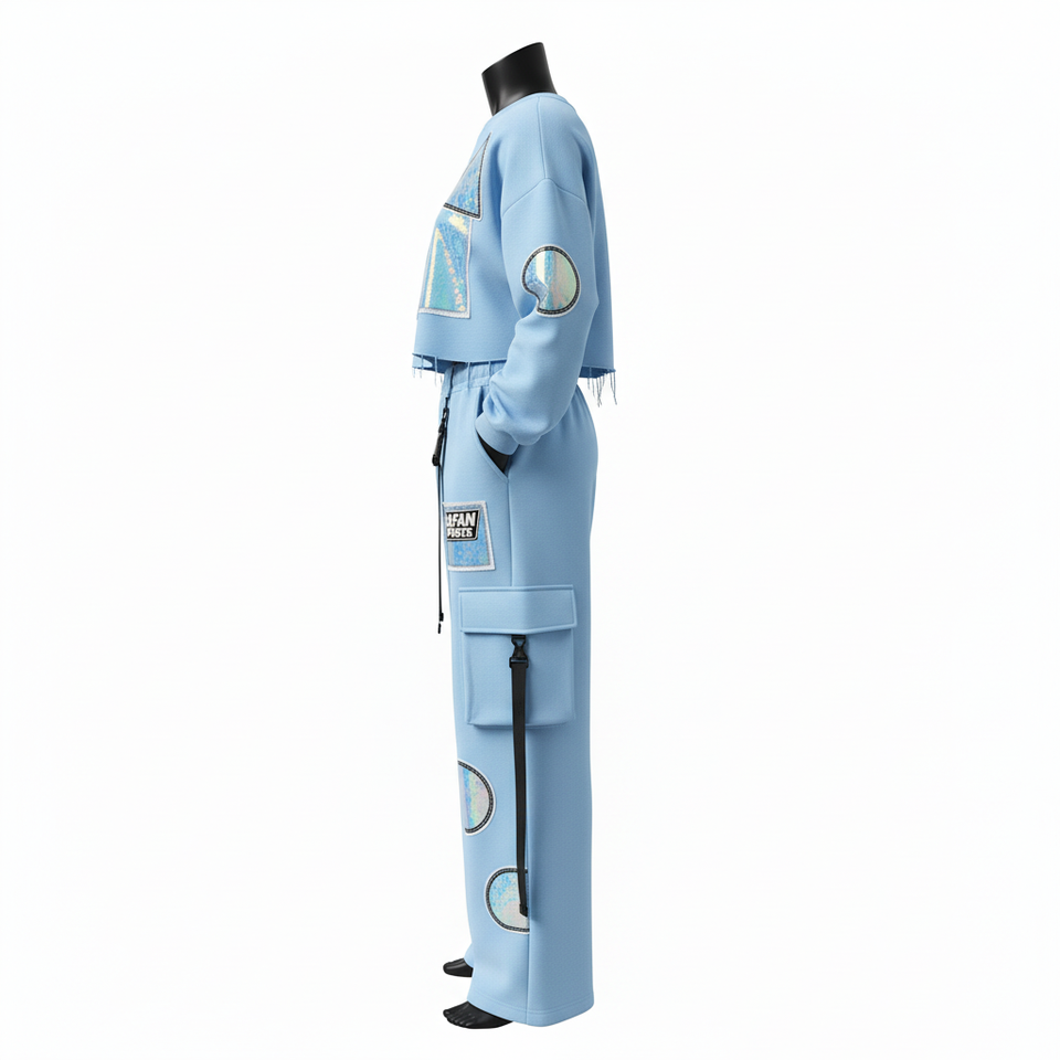 ชุดเซ็ตเสื้อครอปสเวตเชิ้ตผ้าฟลีซคอตตอนโพลีเอสเตอร์พรีเมียม 320 GSM และกางเกงคาร์โก้สีน้ำเงิน พร้อมโลโก้ปักสะท้อนแสงสำหรับผู้หญิง