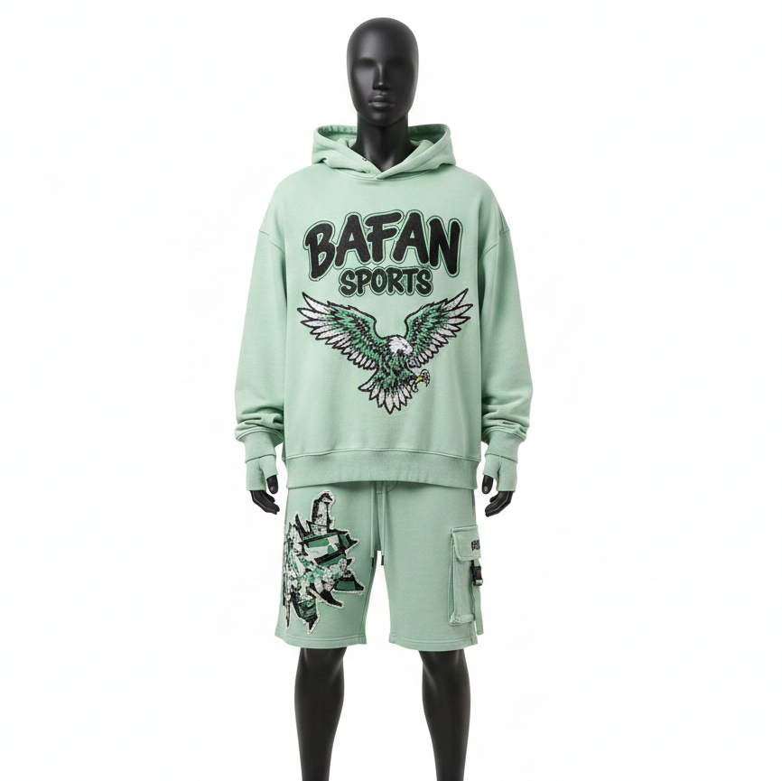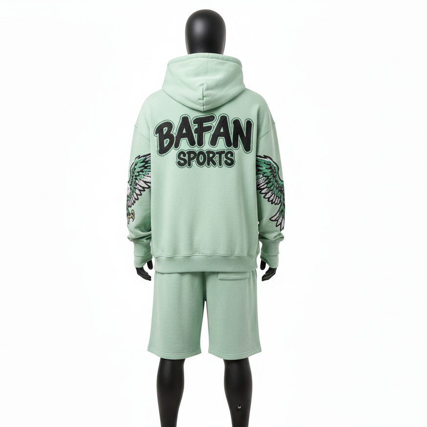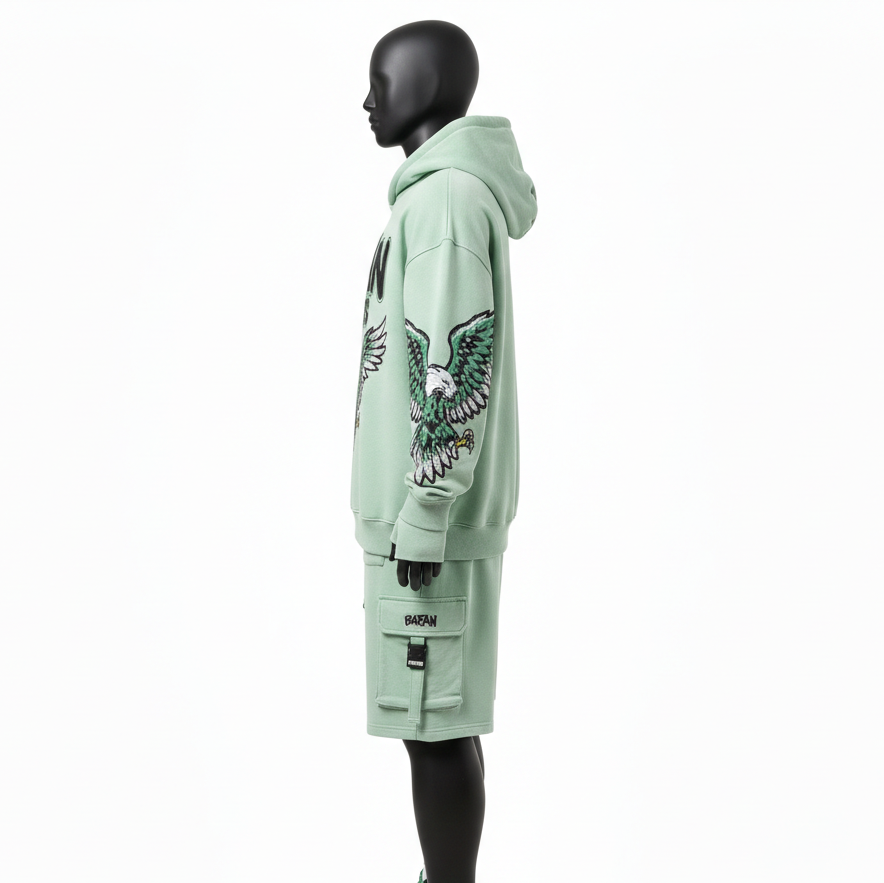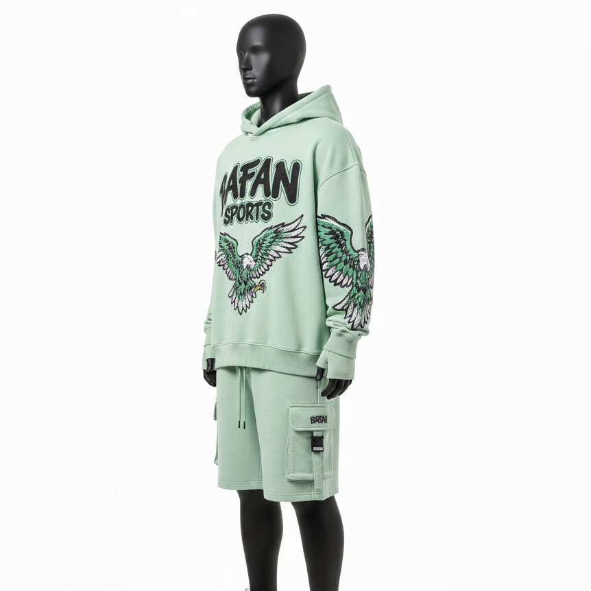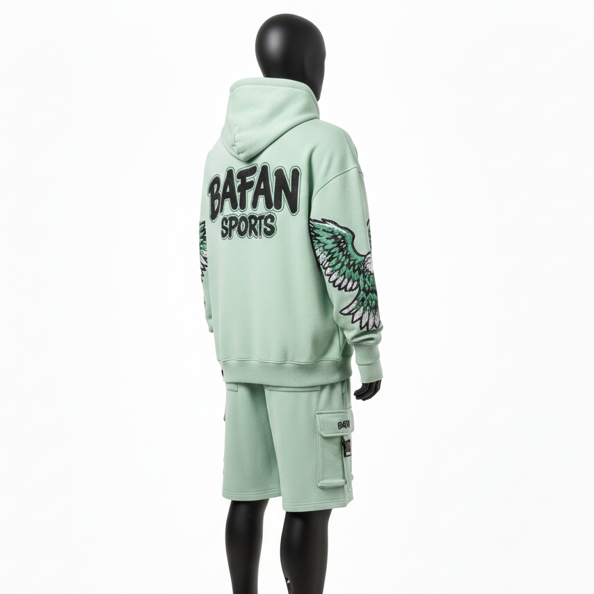ชุดเซ็ตฮู้ดดี้และกางเกงขาสั้นผู้ชาย สีเขียวมิ้นท์ ผ้าคอตตอนโพลีฟลีซ พรีเมียม 320 GSM ปักลายเชนิลล์ พร้อมปักโลโก้ตามสั่ง