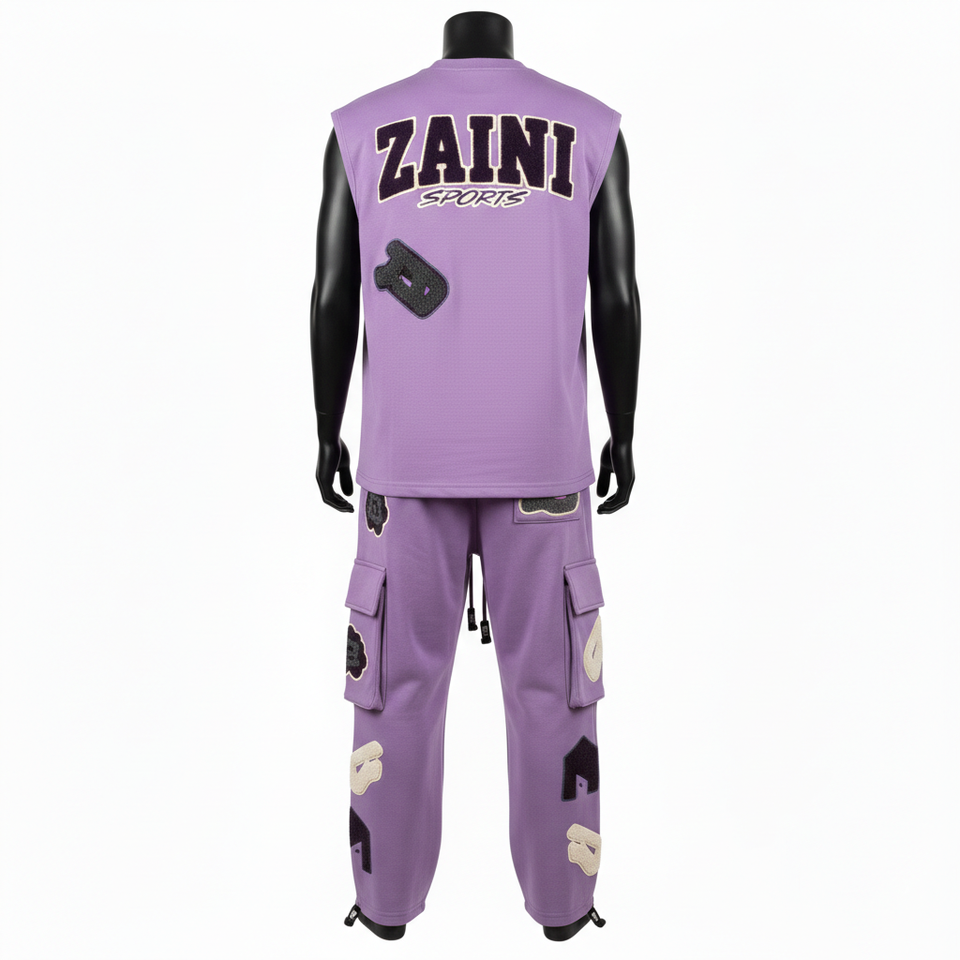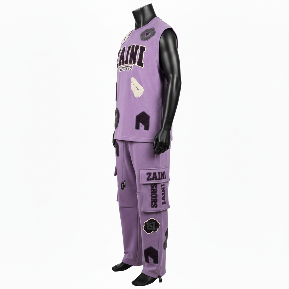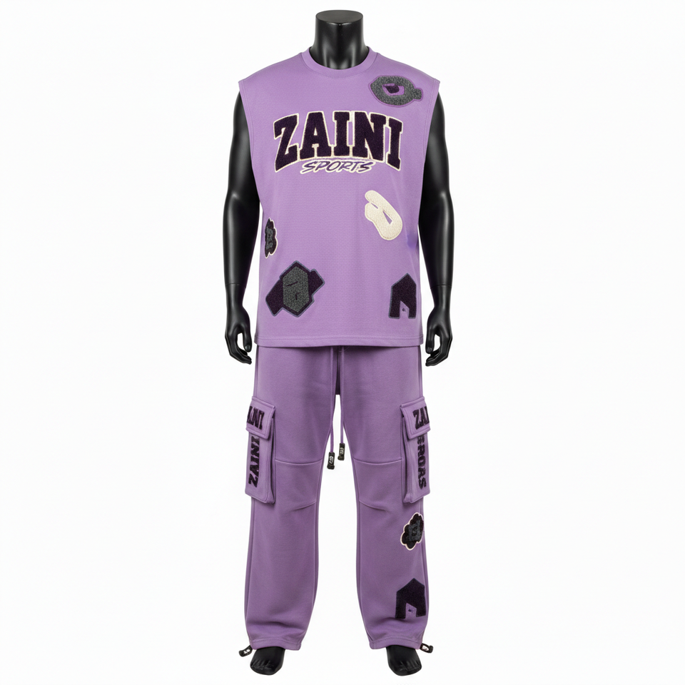ชุดเซ็ตเสื้อกล้ามและกางเกงคาร์โก้ผ้าฝ้ายฟลีซพรีเมียม 320GSM สีม่วงลาเวนเดอร์ ปักลายเชนิลล์ พร้อมปักโลโก้ตามสั่ง ชุด 2 ชิ้นสำหรับผู้ชาย