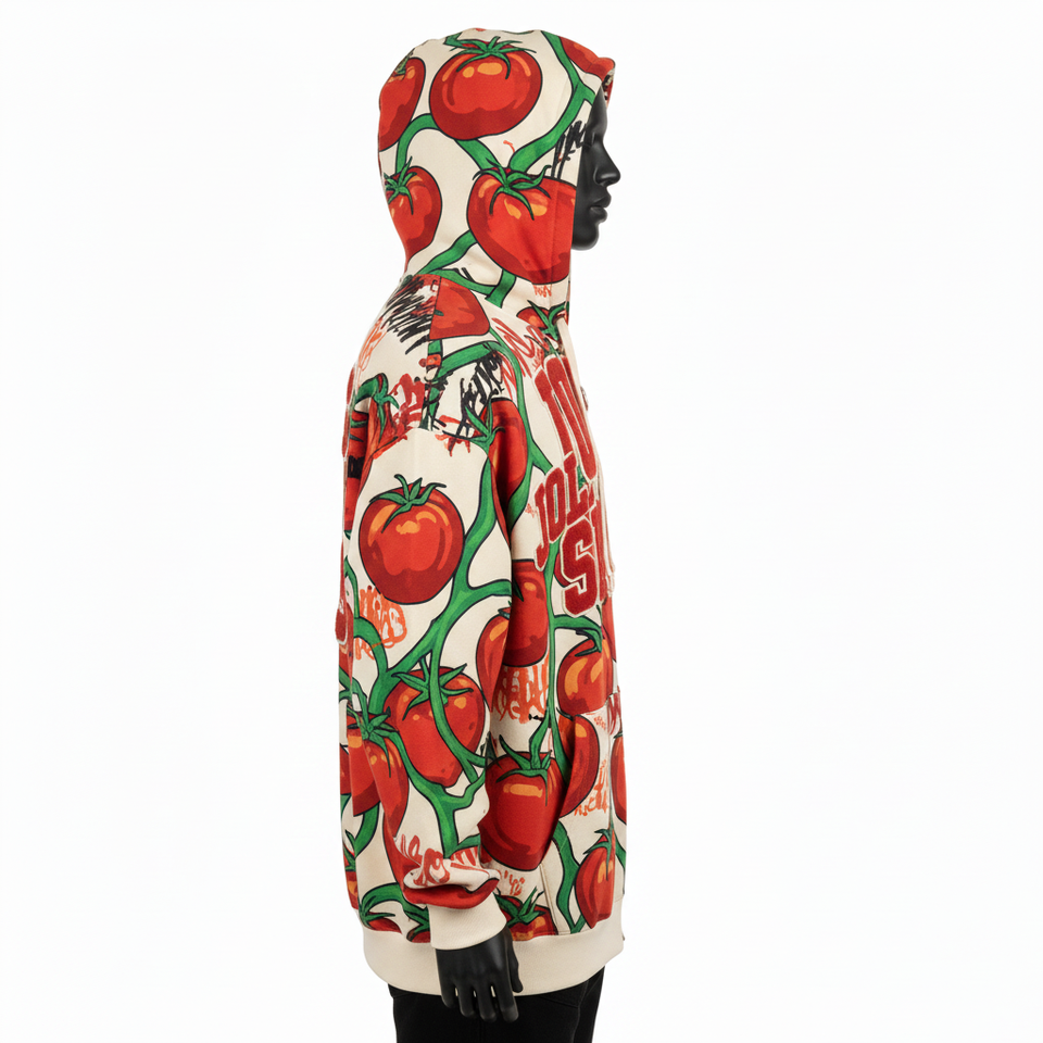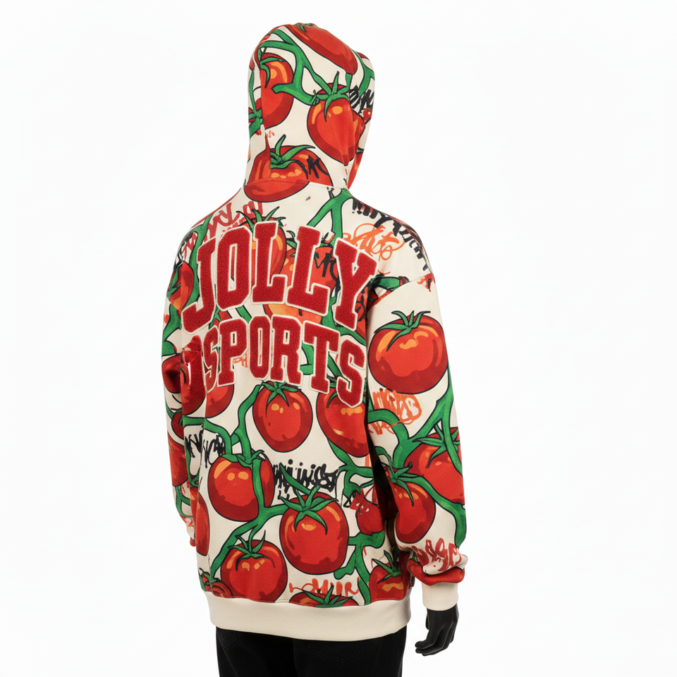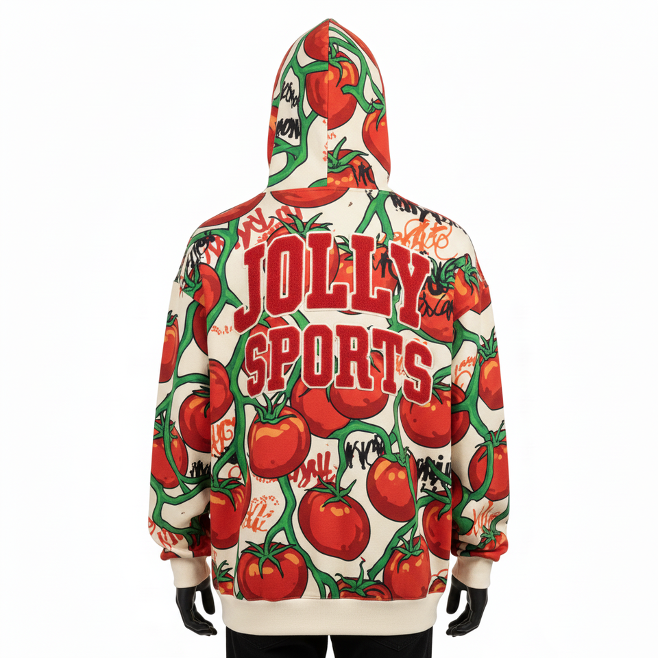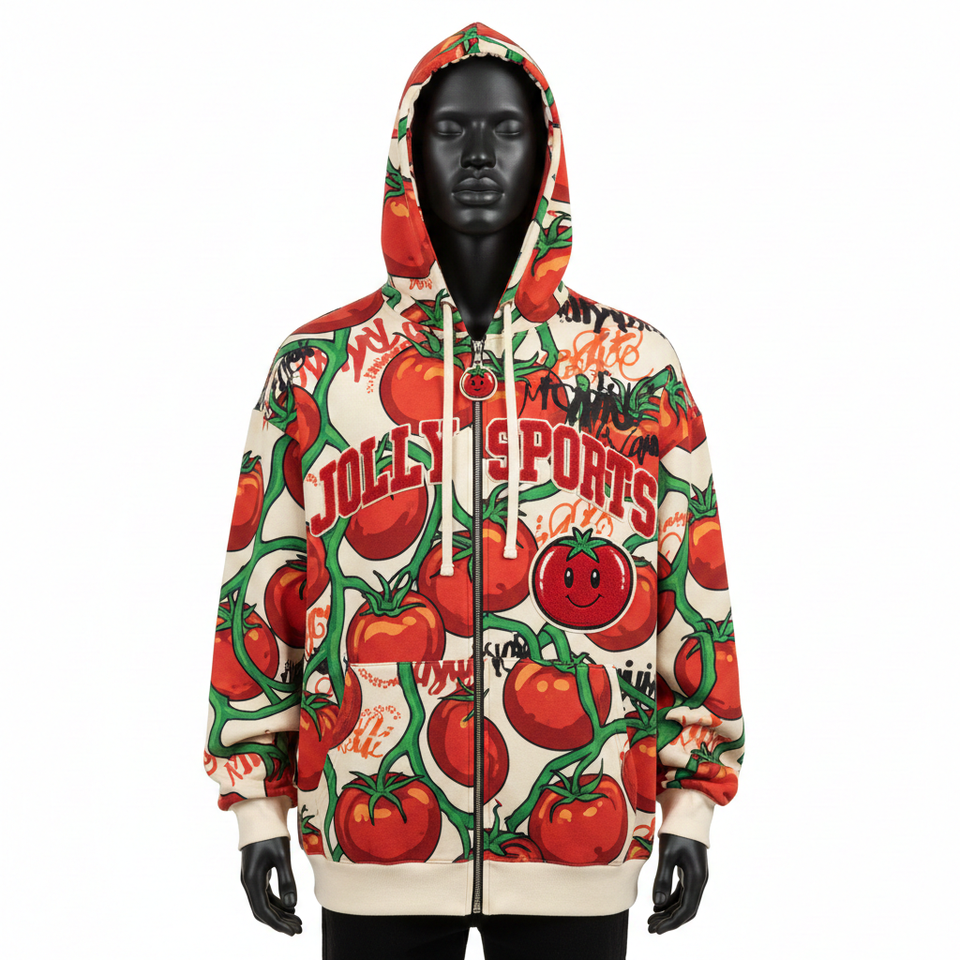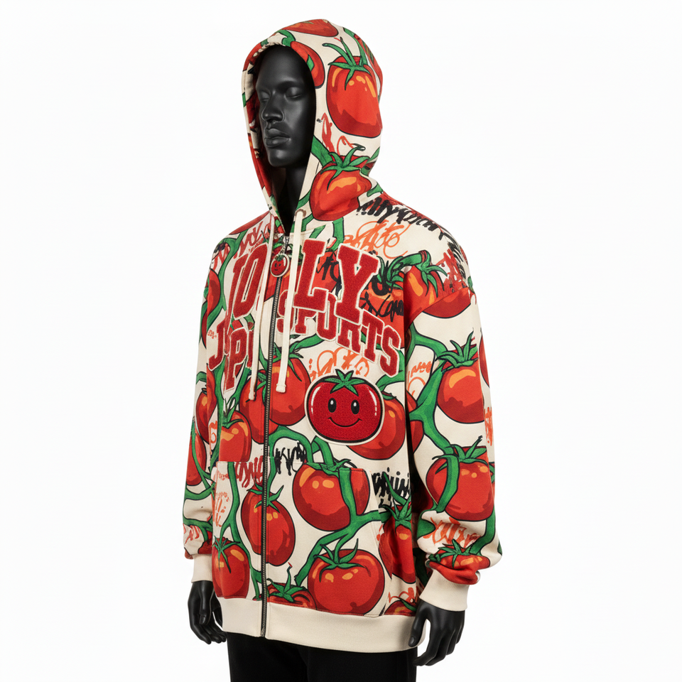 เสื้อฮู้ดซิปผ้าฟลีซคอตตอนพรีเมียม 350 GSM พิมพ์ลายกราฟิกมะเขือเทศทั่วตัว พร้อมปักโลโก้แบบกำหนดเอง เสื้อฮู้ดซิปแบบพื้นฐาน