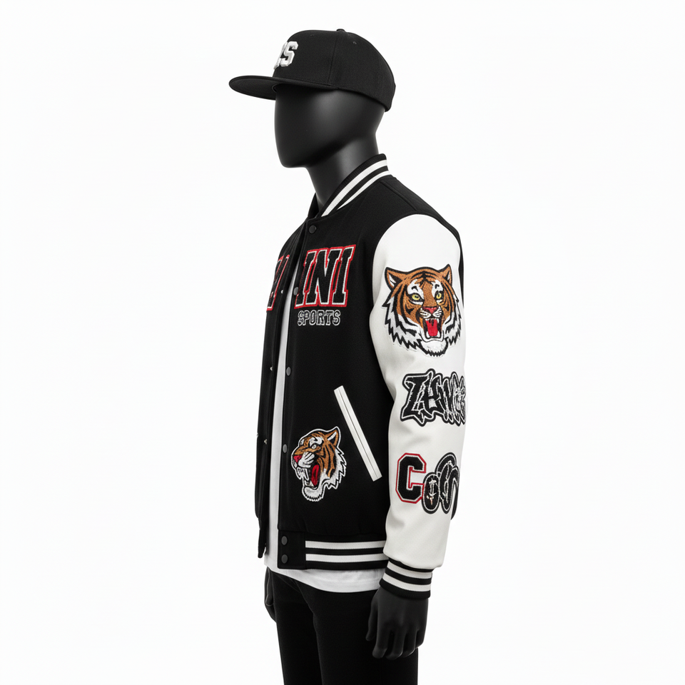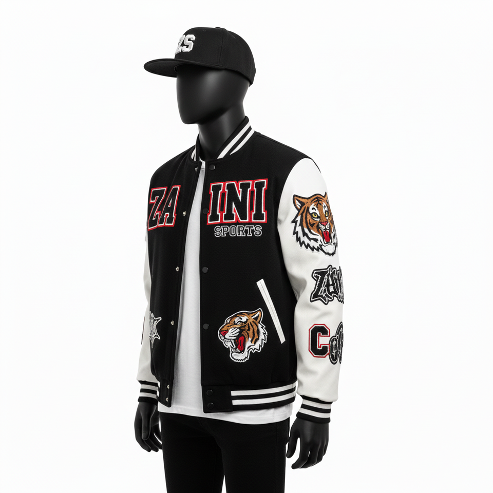 Premium 350GSM Wool Blend Varsity Jacket Black Body White Sleeves Panel Style Custom Embroidery Chenille Varsity Jacket for Men