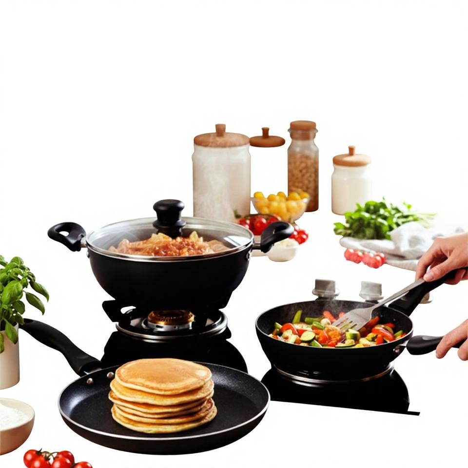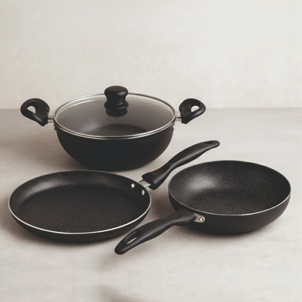 ชุดเครื่องครัวโลหะเคลือบกันติด 3 ชิ้น พรีเมียม คลาสสิก พร้อมกระทะทอดและกระทะกั๊ดไห่ พร้อมฝาแก้ว สำหรับการทำอาหารในครัวทุกวัน