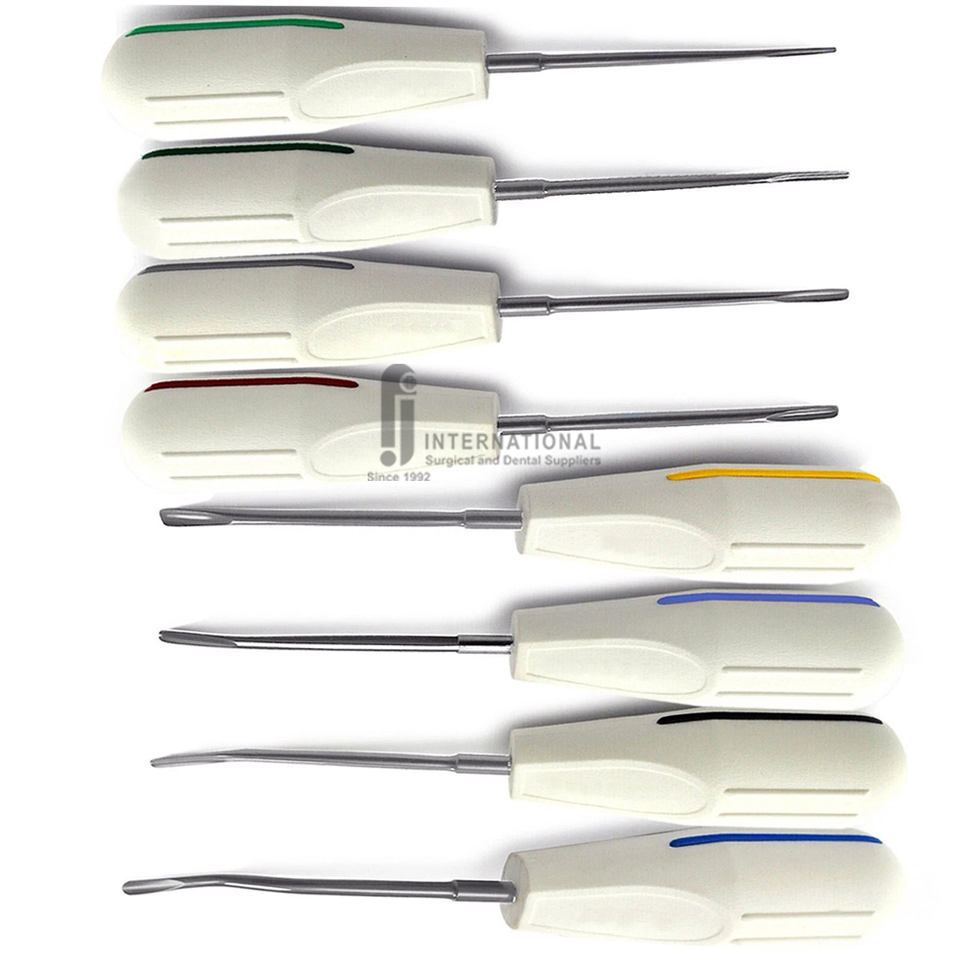 ลิฟต์รักษาความหรูหราทางทันตกรรมแบบพรีเมี่ยม8ชิ้นมือจับสเตนเลสสตีลด้ามจับพลาสติกมาตรฐาน CE ด้ามจับตามหลักสรีรศาสตร์