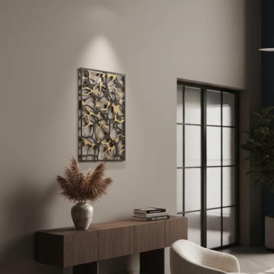 งานศิลปะโลหะติดผนังแบบนามธรรมระดับพรีเมียม สีดำและสีทอง เหมาะสำหรับตกแต่งผนังห้องนั่งเล่น ห้องนอน และสำนักงาน จากอินเดีย