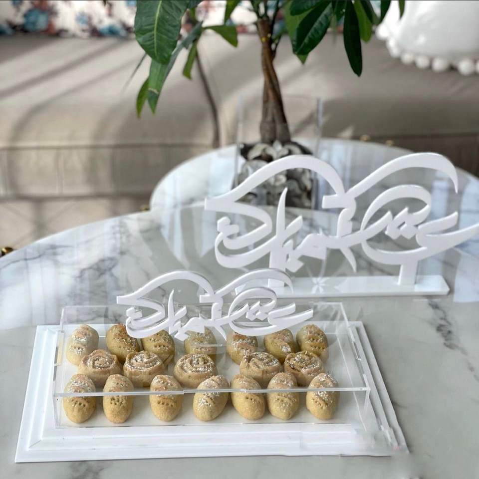 ถาดอะคริลิคพรีเมียมสำหรับใส่ช็อกโกแลต พร้อมดีไซน์ชื่อภาษาอาหรับ สวยงามหรูหรา ใช้จัดขนมหวาน เหมาะสำหรับตกแต่งบ้านและเป็นของขวัญ