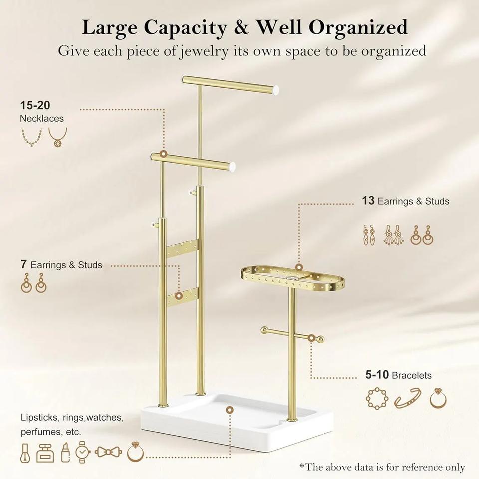 ที่วางเครื่องประดับปรับระดับได้แบบพรีเมียม พร้อมแผงแขวนต่างหูแบบสองชั้น ที่วางสร้อยข้อมือ ฐานกว้าง ดีไซน์หรูหรา จัดระเบียบเครื่องประดับอย่างสวยงาม
