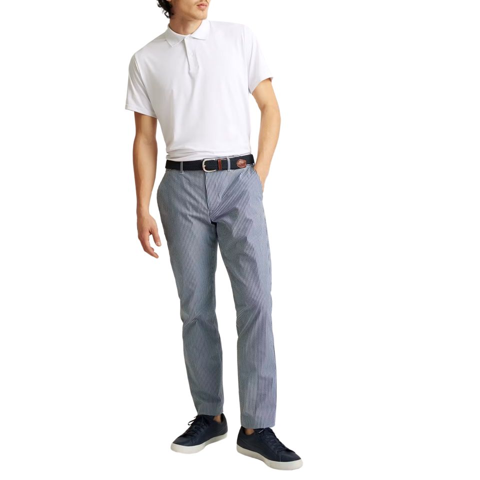 กางเกงกอล์ฟผ้าแคนวาสแบบตรงสำหรับผู้ชายกางเกงผ้าฝ้ายลำลองน้ำหนักเบาเป็นมิตรต่อสิ่งแวดล้อมสีน้ำเงินเข้มขนาดอเมริกันพรีเมี่ยม