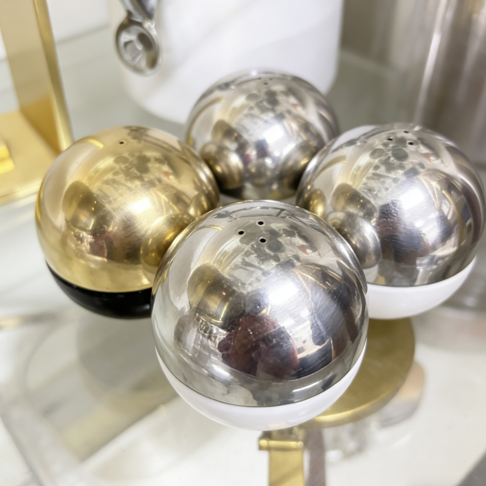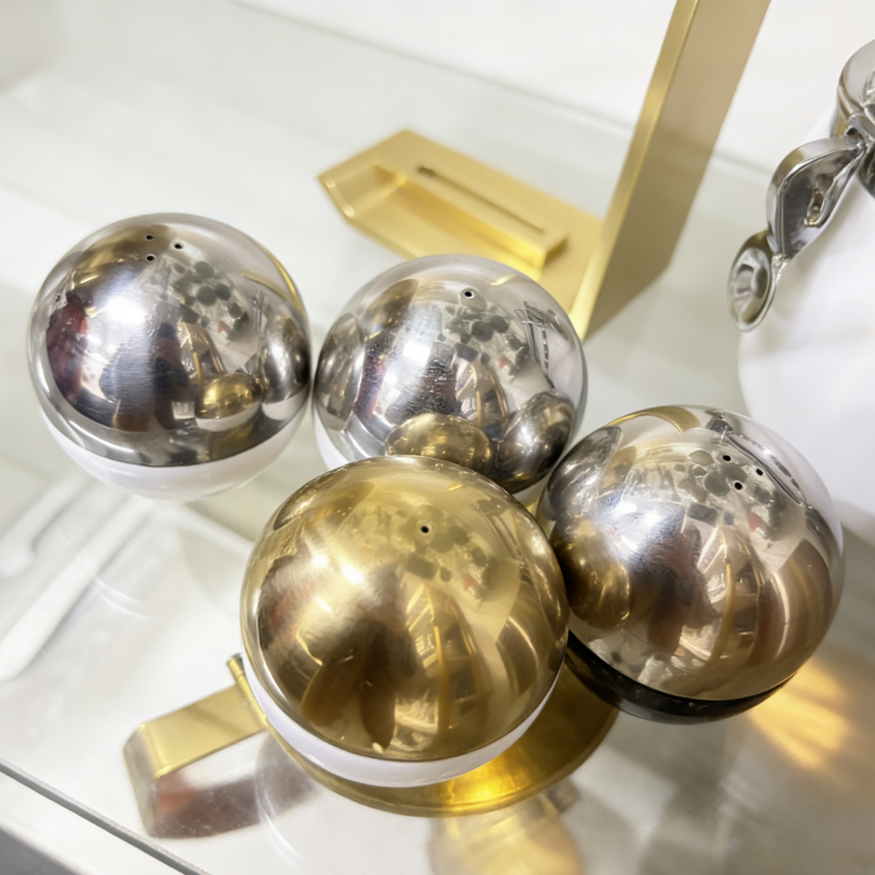 เครื่องบดเครื่องเทศทรงกลมแบบ CNC คุณภาพพรีเมียม ผลิตจากสแตนเลสขัดเงา ได้รับการรับรองมาตรฐาน ISO9001 สำหรับใส่เกลือ พริกไทย บนโต๊ะอาหาร