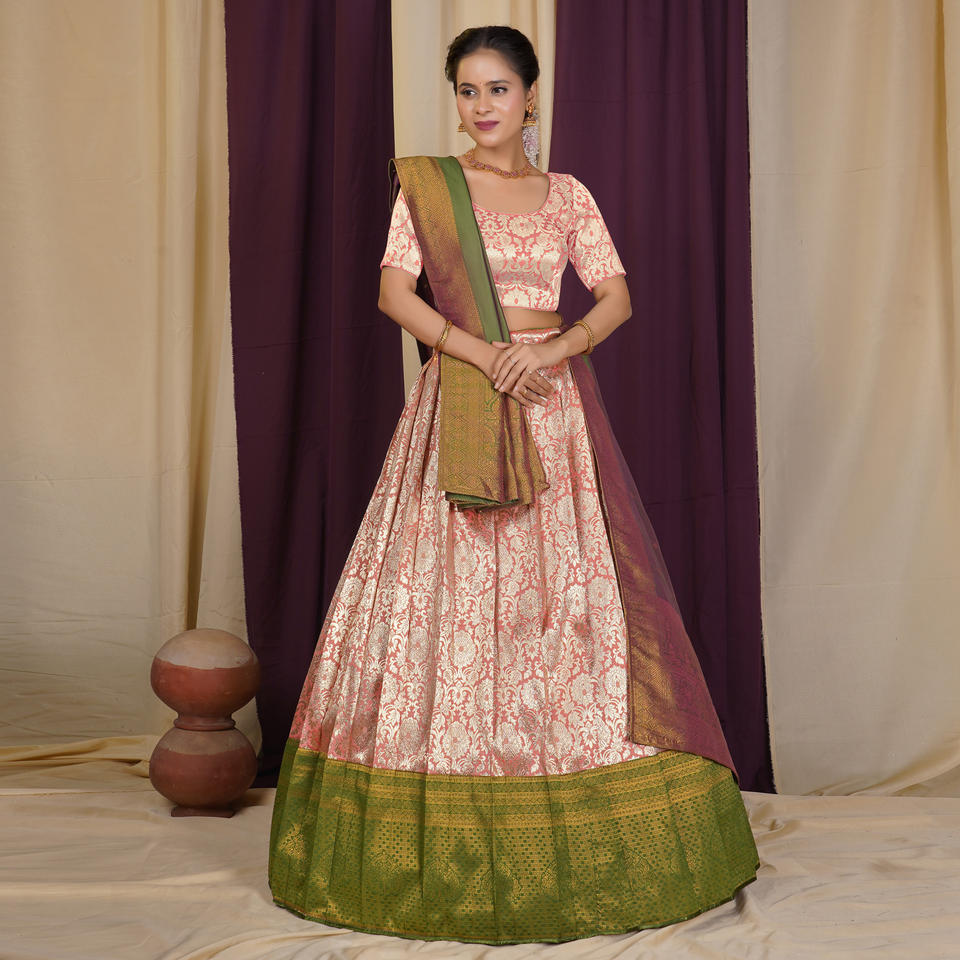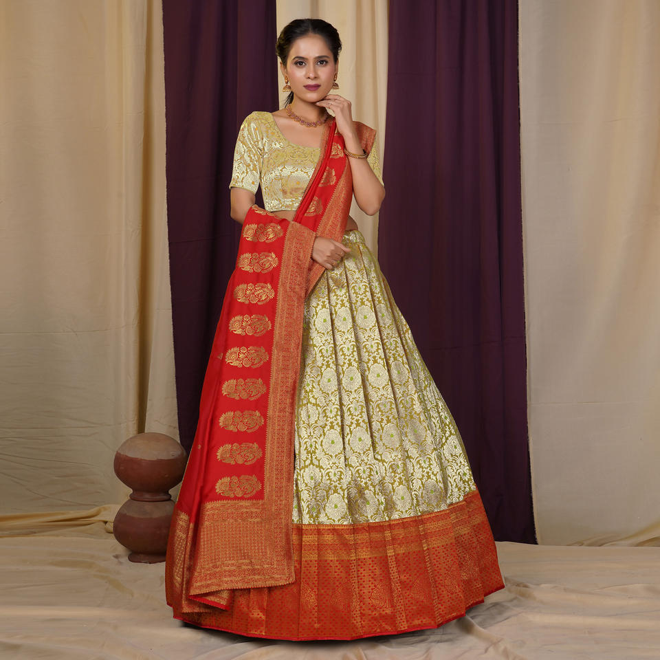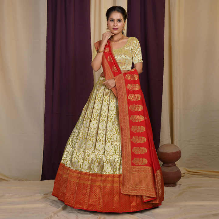 ชุดเลเฮนกาโชลีผ้าไหมบานาราสีพรีเมียม พร้อมลวดลายทอประณีต และผ้าคลุมไหล่เข้าชุด สำหรับงานเลี้ยงฉลองมงคลสมรส