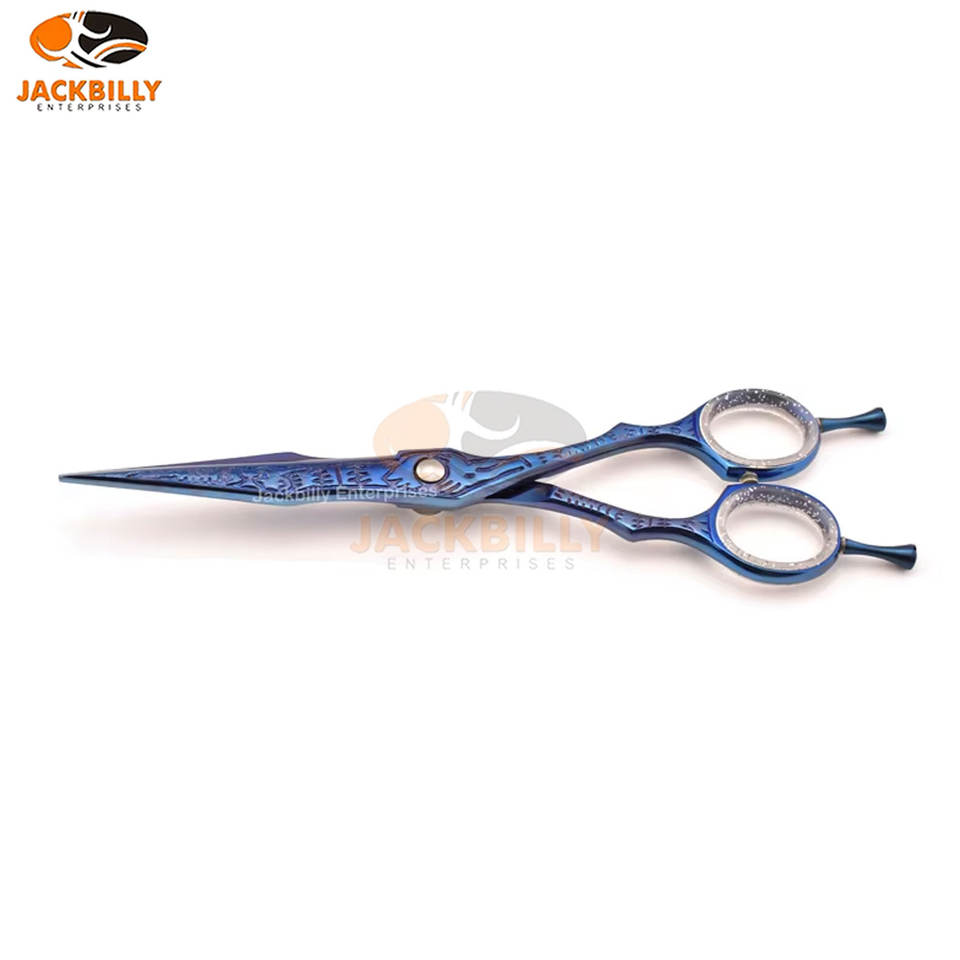 กรรไกรตัดผมคุณภาพสูงดีไซน์มังกรพลาสม่าสีฟ้าดีไซน์เรียบหรูทำจากเหล็กญี่ปุ่น