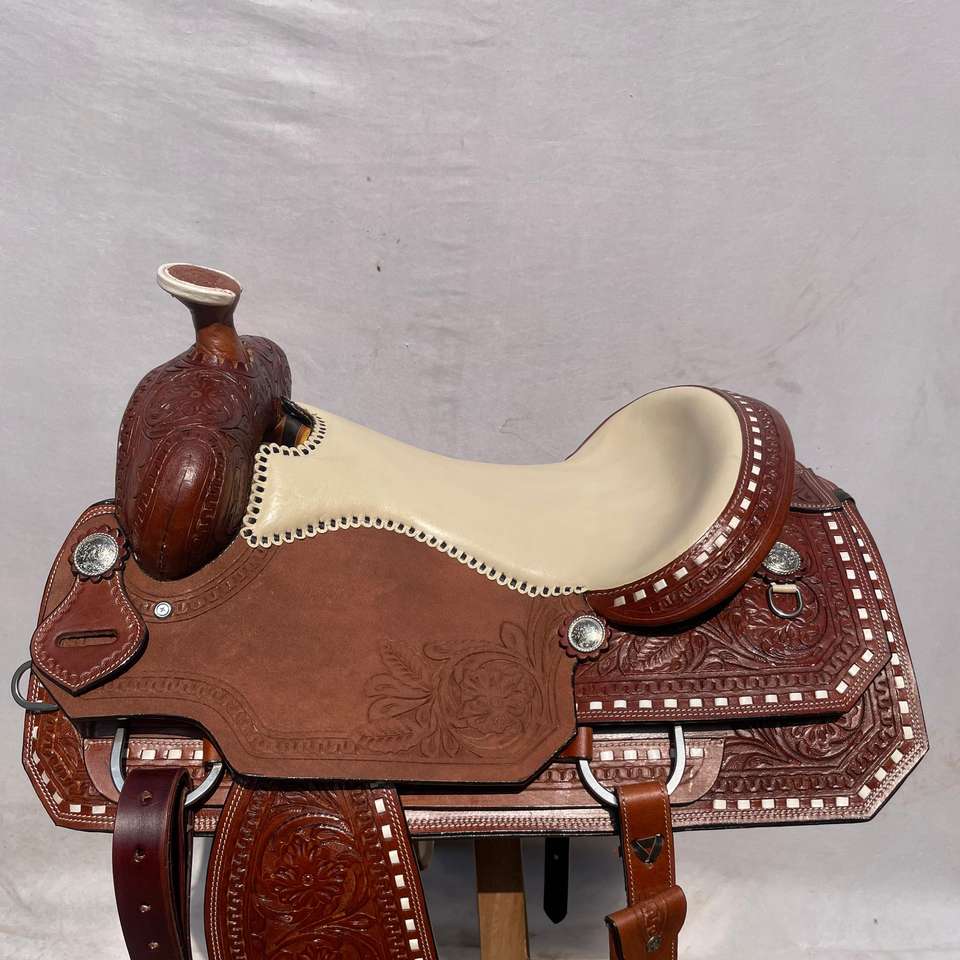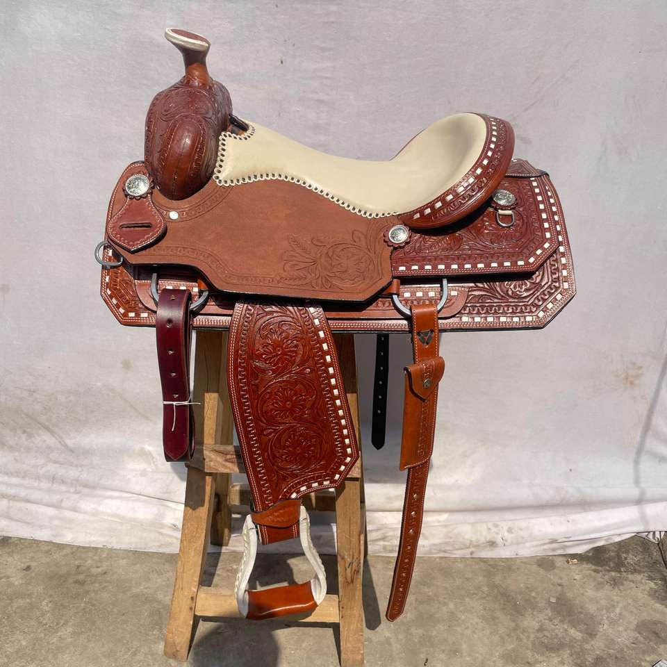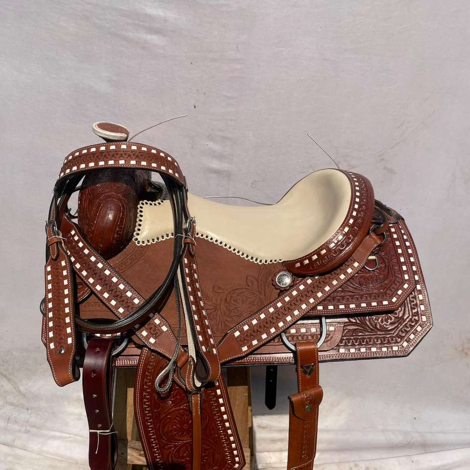 ชุดอานม้าหนังแท้สไตล์ตะวันตกพร้อมงานศิลปะ ทำจากไม้คุณภาพพรีเมียม | ชุดอุปกรณ์ขี่ม้าทำมือจากเหล็กกล้าไร้สนิม พร้อมชุดตะขอเกี่ยวฟรี