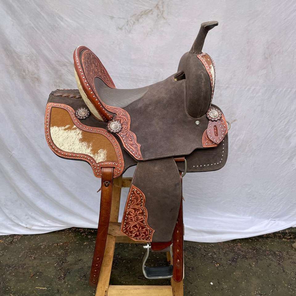 ชุดอานม้าหนังแท้สไตล์ตะวันตกพร้อมโครงไม้ ลายงานศิลปะบาร์เรลเรซซิ่งระดับพรีเมียม | อุปกรณ์ขี่ม้าทำมือจากเหล็กกล้าไร้สนิม