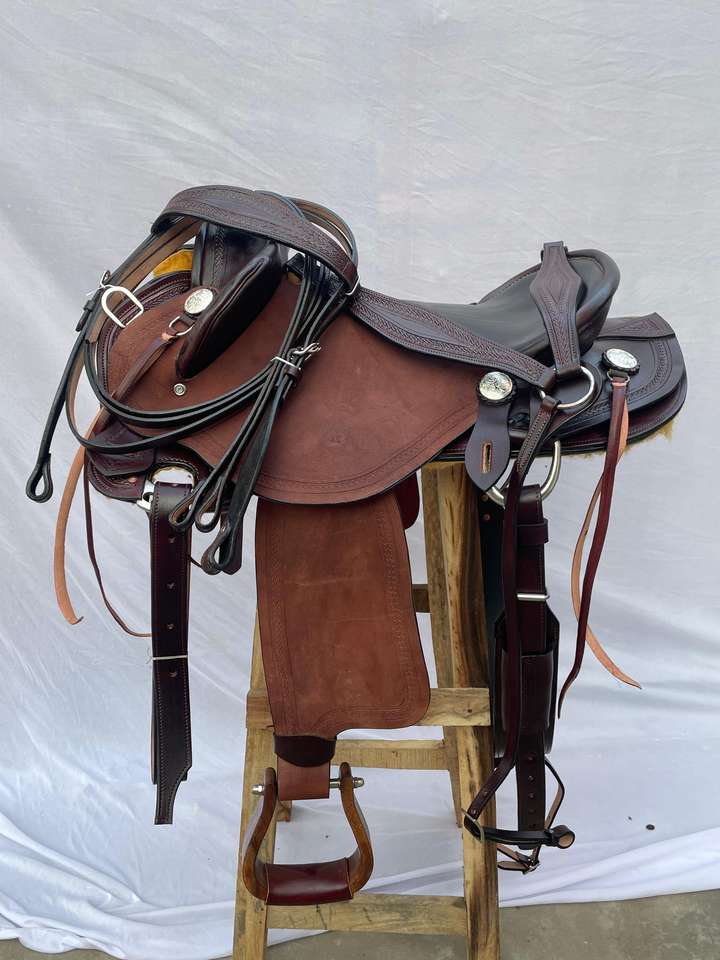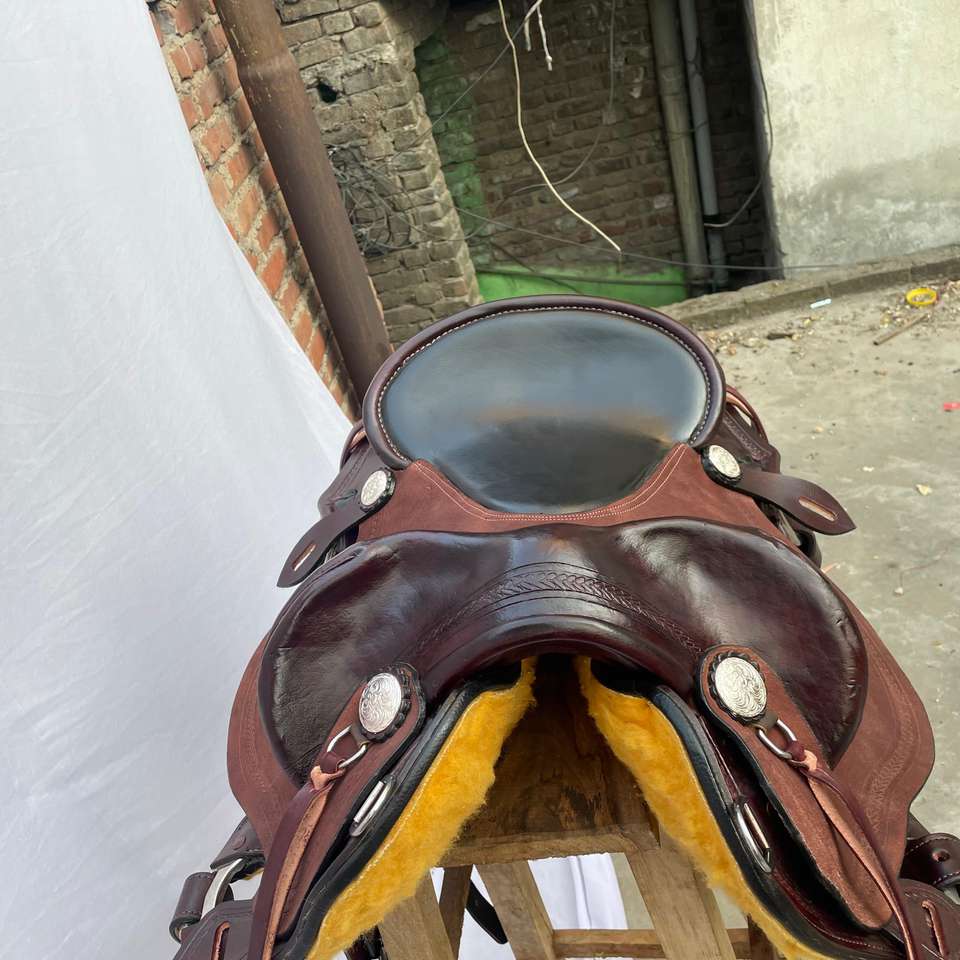 ชุดอานม้าหนังแท้สไตล์ตะวันตกพร้อมงานศิลปะ ทำจากไม้คุณภาพพรีเมียม | ชุดอุปกรณ์ขี่ม้าทำมือจากเหล็กกล้าไร้สนิม พร้อมชุดตะขอเกี่ยวฟรี