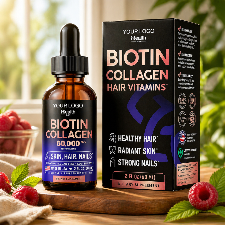 วิตามินบำรุงผมสูตรพรีเมียม OEM ไบโอติน คอลลาเจน ชนิดหยด สำหรับผู้ใหญ่ ดูดซึมได้ดี ช่วยเร่งการเจริญเติบโตของเส้นผมและเสริมสร้างภูมิคุ้มกัน