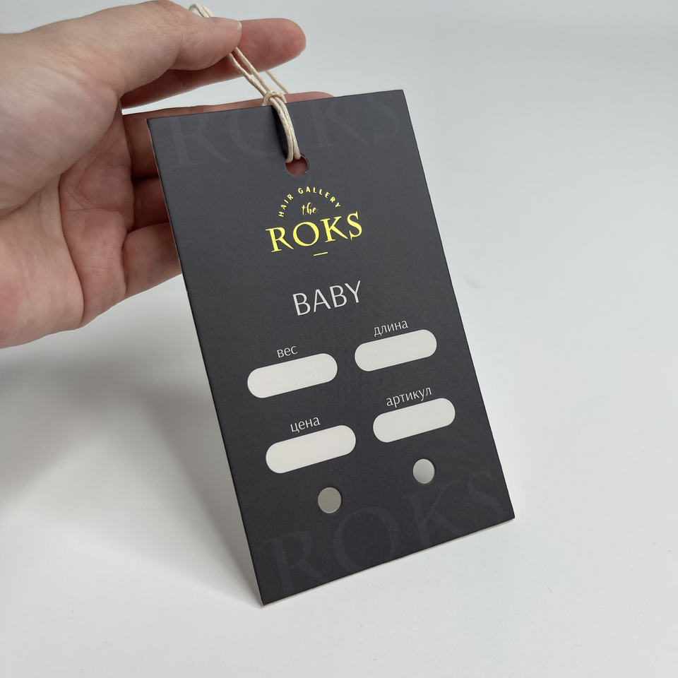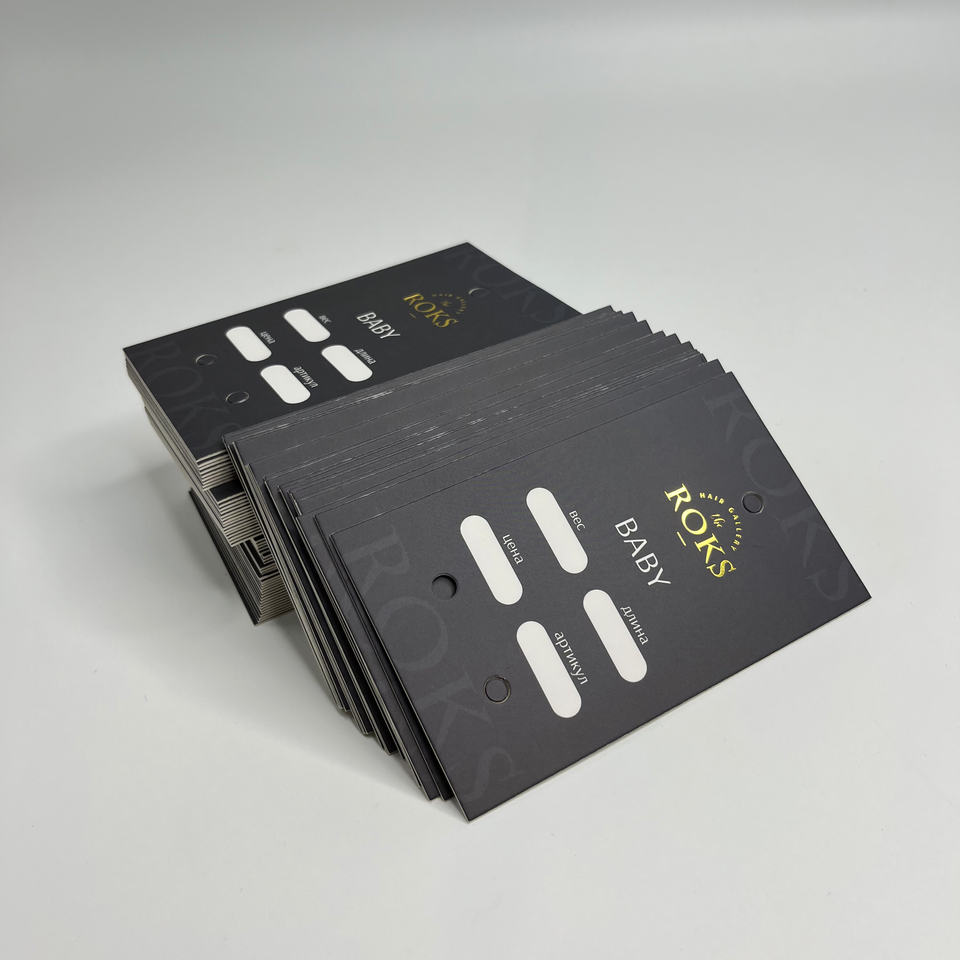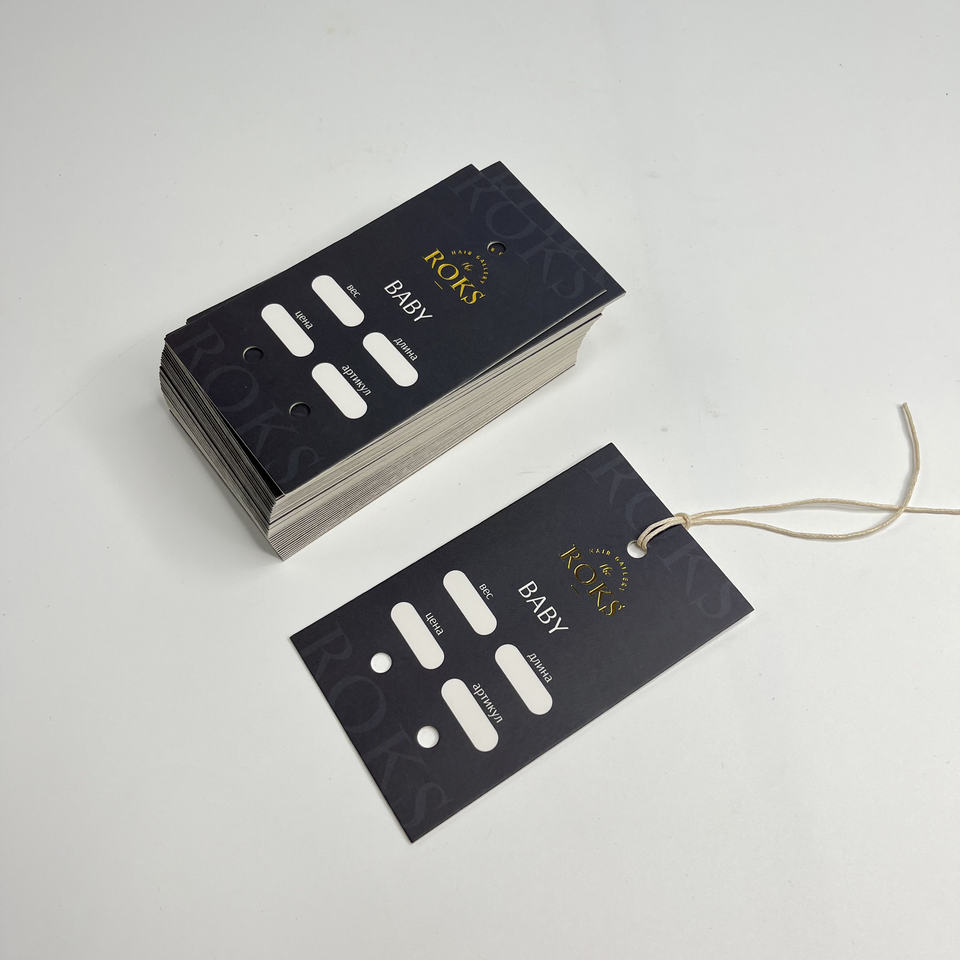 ป้ายแขวนสีดำพรีเมียม 3 รู พร้อมปั๊มฟอยล์ทอง - ป้ายแบรนด์หรูสำหรับเสื้อผ้าบูติก