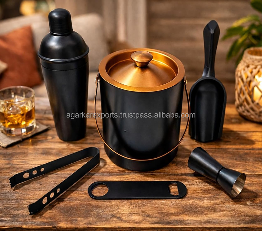 ชุดเครื่องมือบาร์เชคเกอร์ค็อกเทลสีดำพรีเมียมพร้อมกล่องน้ำแข็ง – ชุดบาร์เทนเดอร์สแตนเลส (6 ชิ้น) ขายส่ง