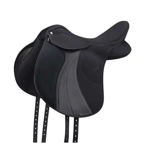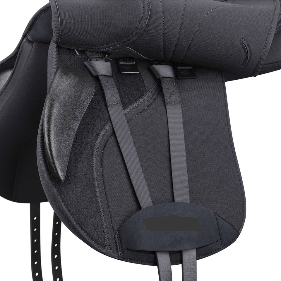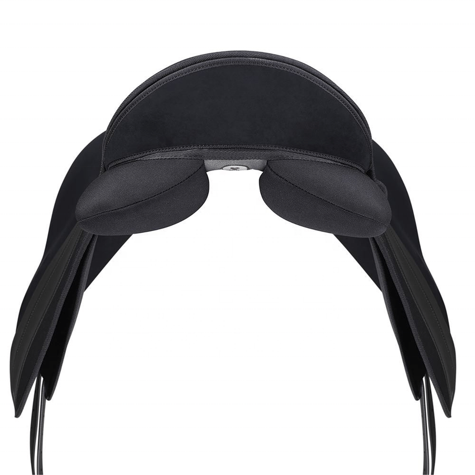 อานม้าหนังแท้สีดำพรีเมียมสำหรับเดรสสาจ แบบนั่งลึก บุนุ่ม ทนทาน โครงสร้างแข็งแรง เหมาะสำหรับการฝึกขี่ม้าระดับมืออาชีพ พร้อมอุปกรณ์ทองเหลือง