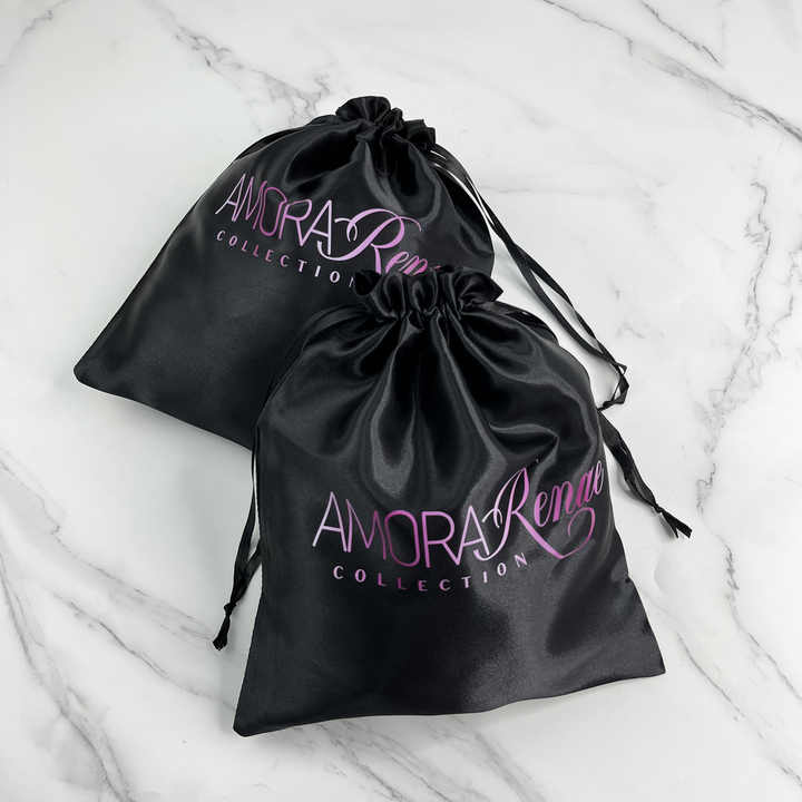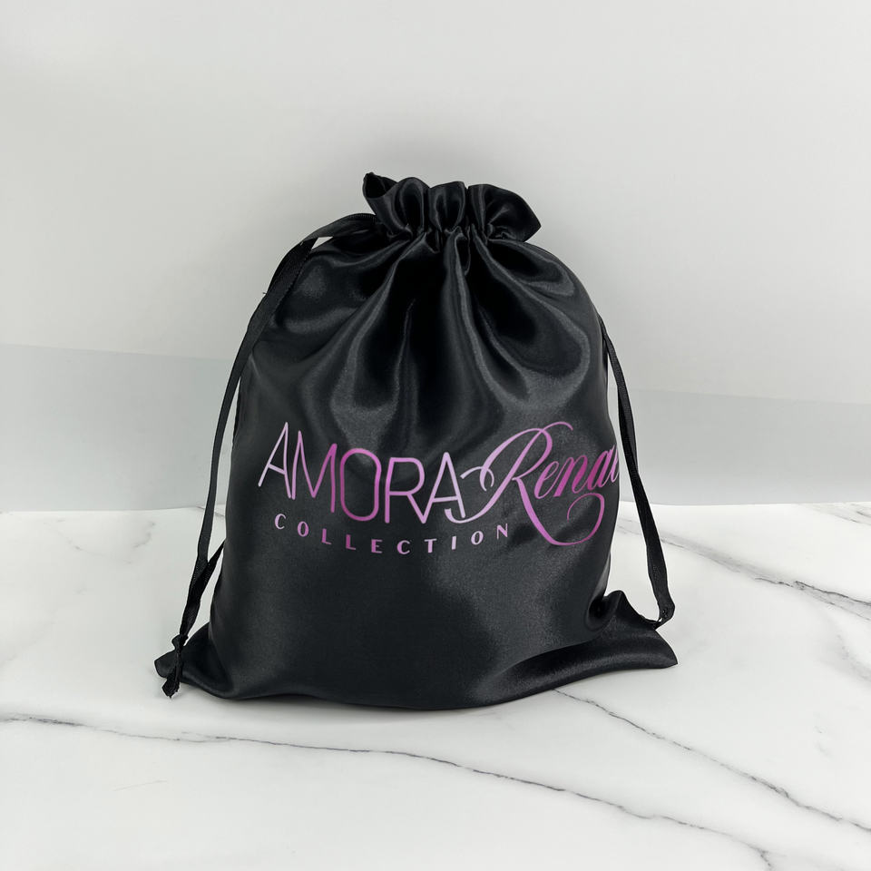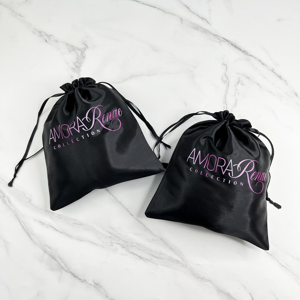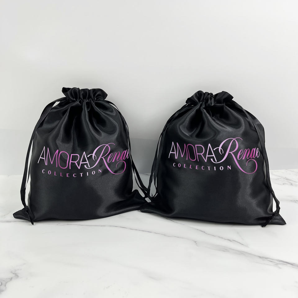 ถุงผ้าซาตินสีดำพรีเมียมพร้อมพิมพ์โลโก้แบบไล่เฉดสี - ถุงผ้ารูดเชือกแบบกำหนดเองสำหรับวิกผมและผลิตภัณฑ์ความงาม