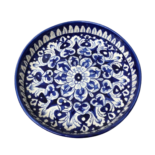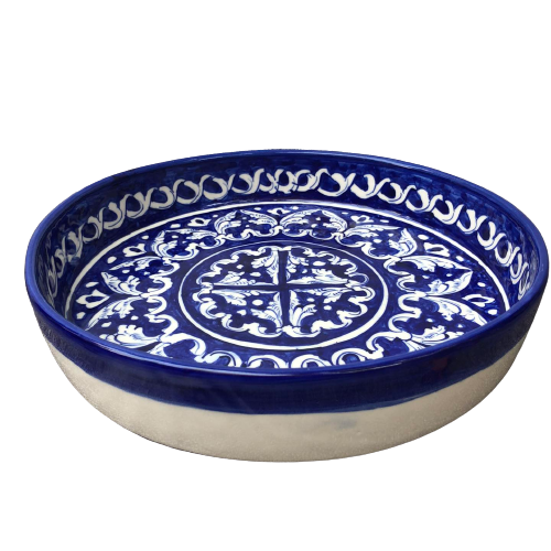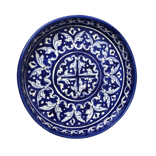 จานเสิร์ฟเซรามิกทาสีด้วยมือเครื่องปั้นดินเผาสีฟ้าแบบพรีเมี่ยม