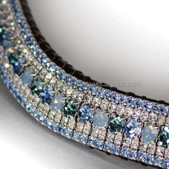 คริสตัลแบรนด์พรีเมี่ยมคริสตัล5แถวสีฟ้าอ่อนและคริสตัลใสผสมสายรัดคิ้วม้าหนังสีดำสุดหรู