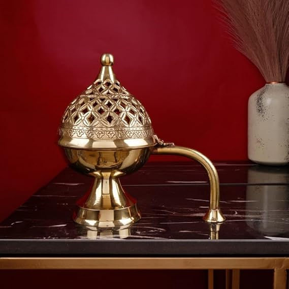 เตาเผาบัคฮูร์ทองเหลืองพรีเมียม ทำมือ ด้ามจับไม้จันทน์หอม เครื่องกระจายกลิ่นอโรมาเธอราพีเพื่อการศักดิ์สิทธิ์ เป็นมิตรกับสิ่งแวดล้อม ผลิตภัณฑ์ออร์แกนิก กำยานอินเดีย