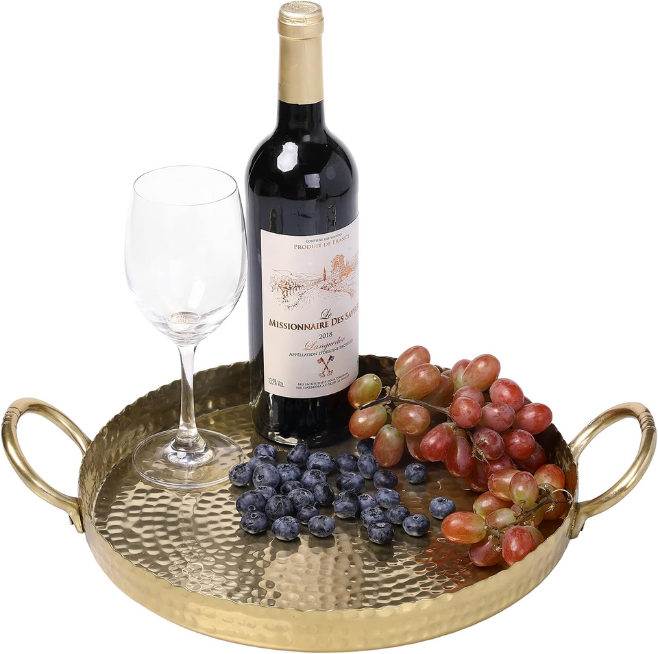 ถาดทองเหลืองพร้อมลายนูนลายดอกไม้พร้อมที่จับที่ทันสมัยถาดเสิร์ฟและจัดแสดงอเนกประสงค์สำหรับบ้านและโอกาสรับประทานอาหาร