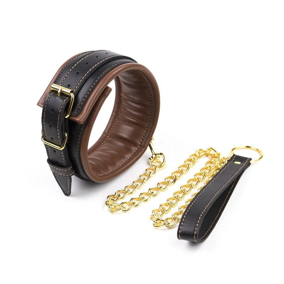 ชุดเกียร์ BDSM สีน้ำตาลพรีเมี่ยมพร้อมปลอกฮาร์ดแวร์ทองและสายจูงข้อเท้าและกุญแจมือสำหรับสายรัดข้อมือหนัง BGO-0044