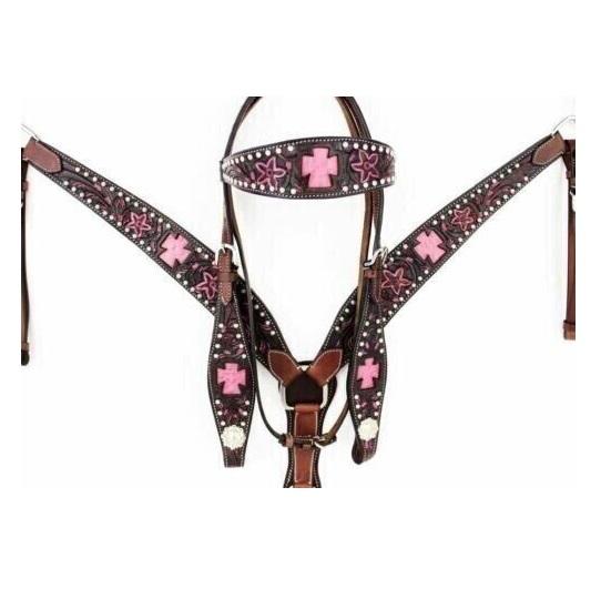 ชุดหัวและที่รองแขนแบบตะวันตกหนังสีน้ำตาลพรีเมี่ยมดีไซน์ไขว้สีชมพูอุปกรณ์ด้วยมือผู้ผลิตขายส่ง