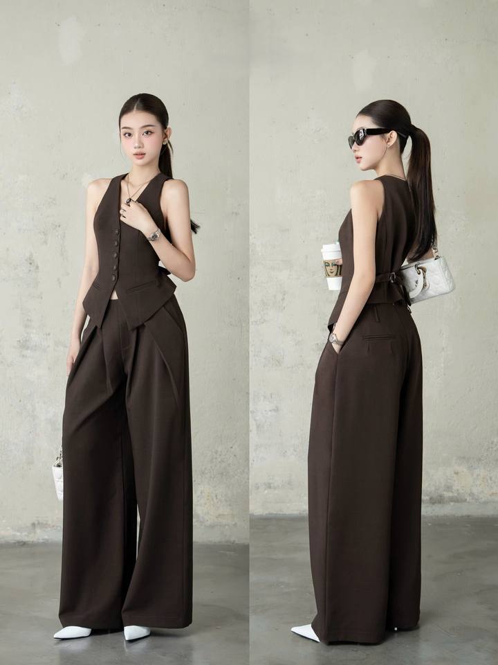 ชุดเสื้อกั๊กสีน้ำตาลพรีเมียม + กางเกงขายาวทรงตรง สไตล์ทางการ มีตัวอย่างให้ดู ผ้าโพลีเอสเตอร์ผสม ทอ คอวี