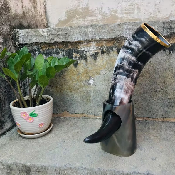 แก้วมักมธุรสแบบพกพาพร้อมขาตั้งแก้วมธุรสเนื้อขัดมันของแท้เครื่องดื่มไวกิ้งสไตล์บัฟฟาโลฮอร์น