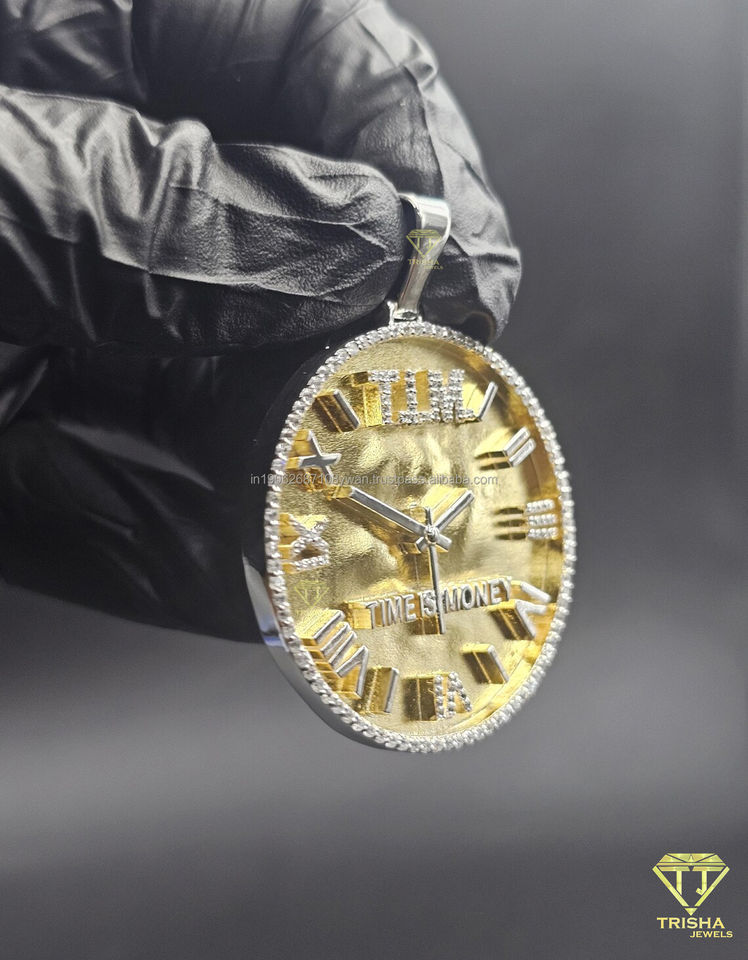 จี้นาฬิกาทรงกลมพรีเมียม ประดับเพชรเต็มหน้าปัด ดีไซน์หรูหรา แรงบันดาลใจจากคำพูด "Time Is Money" พร้อมตัวเลขโรมัน