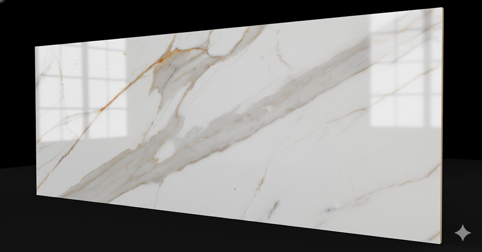 กระเบื้องพอร์ซเลนลายหินอ่อนคาลาคัตต้าสีขาวพรีเมียม ขนาด 600x1200 มม. 60x120 ซม. GVT PGVT ผิวเงา ลายเส้นสีทอง สำหรับปูพื้นและผนัง