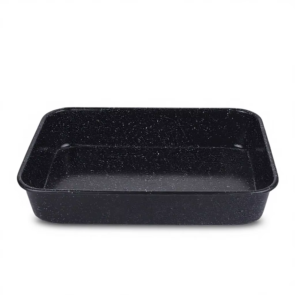 ถาดอบทรงสี่เหลี่ยมผืนผ้าทำจากเหล็กกล้าคาร์บอนคุณภาพสูง พร้อมเคลือบหินแกรนิตหลายชั้นแบบไม่ติดกระทะ ใช้กับเตาอบได้ กระจายความร้อนได้สม่ำเสมอ