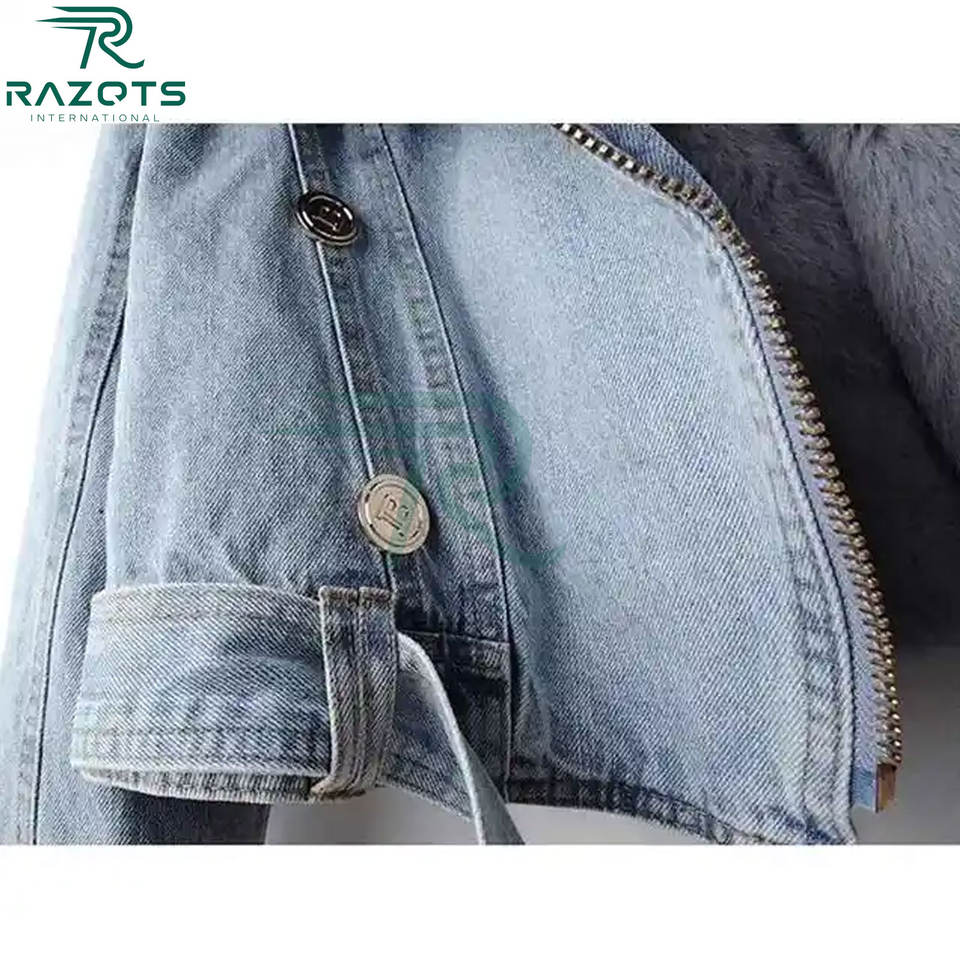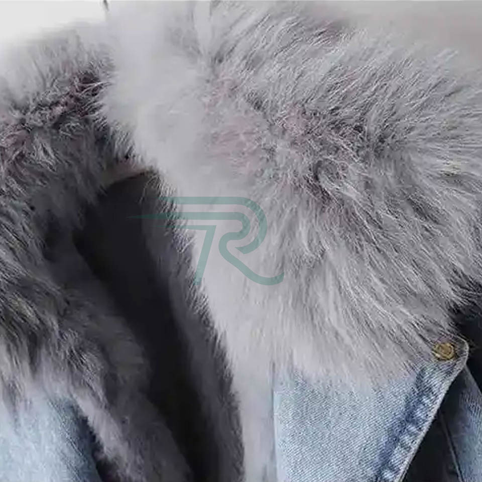 แจ็กเก็ตยีนส์สไตล์ลำลองแบบพรีเมียมพร้อมโลโก้ที่กำหนดเองและเสื้อแจ็กเก็ตยีนส์คุณภาพสูงสำหรับผู้หญิงพร้อมขนเฟอร์