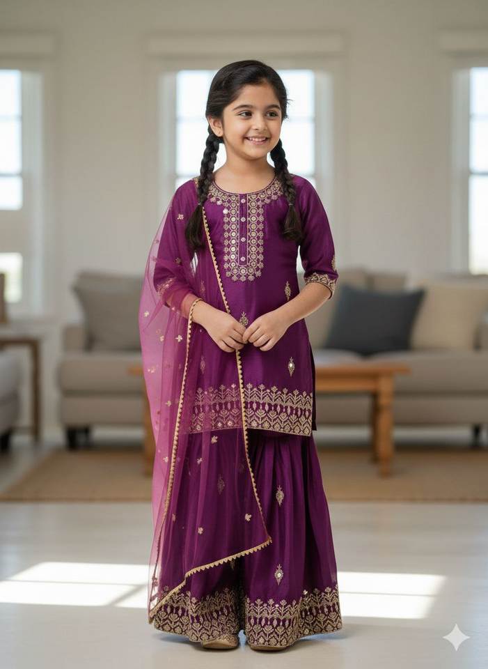 Premium Chinon Silk Kids Palazzo Suit with Embroidery & Net Dupatta – Festive & Wedding Wear