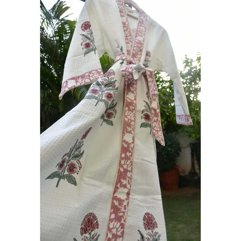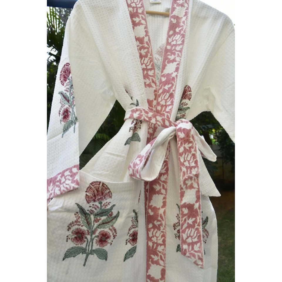 ชุดคลุมอาบน้ำผ้าฝ้ายวาฟเฟิลลายบล็อกพิมพ์มือสีชมพูเบิร์นท์ สไตล์คลาสสิกระดับพรีเมียม แขนยาวสำหรับผู้หญิง พร้อมเชือกผูกปรับได้ รับสกรีนโลโก้ เนื้อผ้านุ่ม