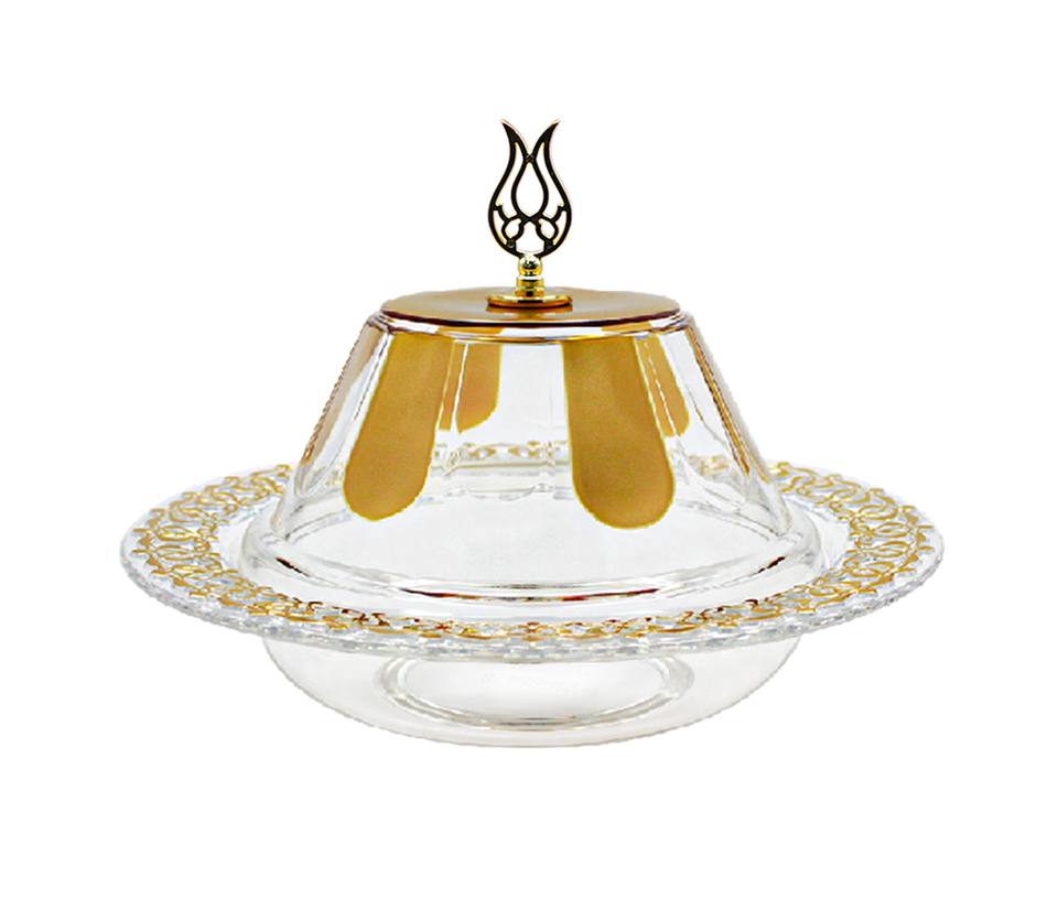 ถาดเสิร์ฟอะคริลิกใสพรีเมียมพร้อมฝาครอบทรงโดม ตกแต่งด้วยสีทองอย่างหรูหราและมีลวดลายสวยงาม