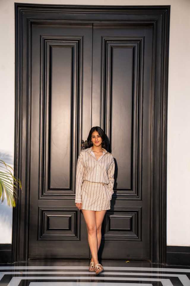 ชุดผ้าฝ้ายผสมแบบพรีเมี่ยมสำหรับผู้หญิงชุดวันหยุดพักผ่อนลายทางสีทะเลทรายมีกระดุมยาวถึงเข่าสองชิ้นคลาสสิกตกแต่งทรงหลวม