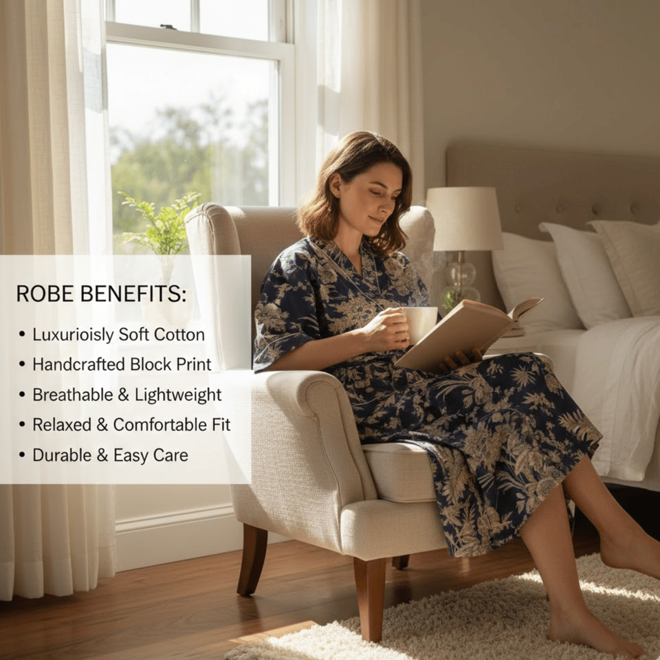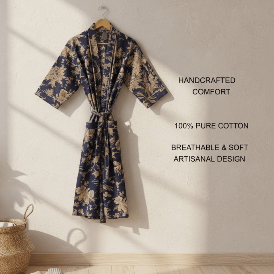 ชุดกิโมโนผ้าฝ้ายพรีเมียมลายดอกไม้สำหรับผู้หญิง คอวี แขนยาว ความยาวเต็มตัว มีกระเป๋าหน้า 2 ช่อง พร้อมเชือกผูกเอว ชุดนอน ชุดลำลอง