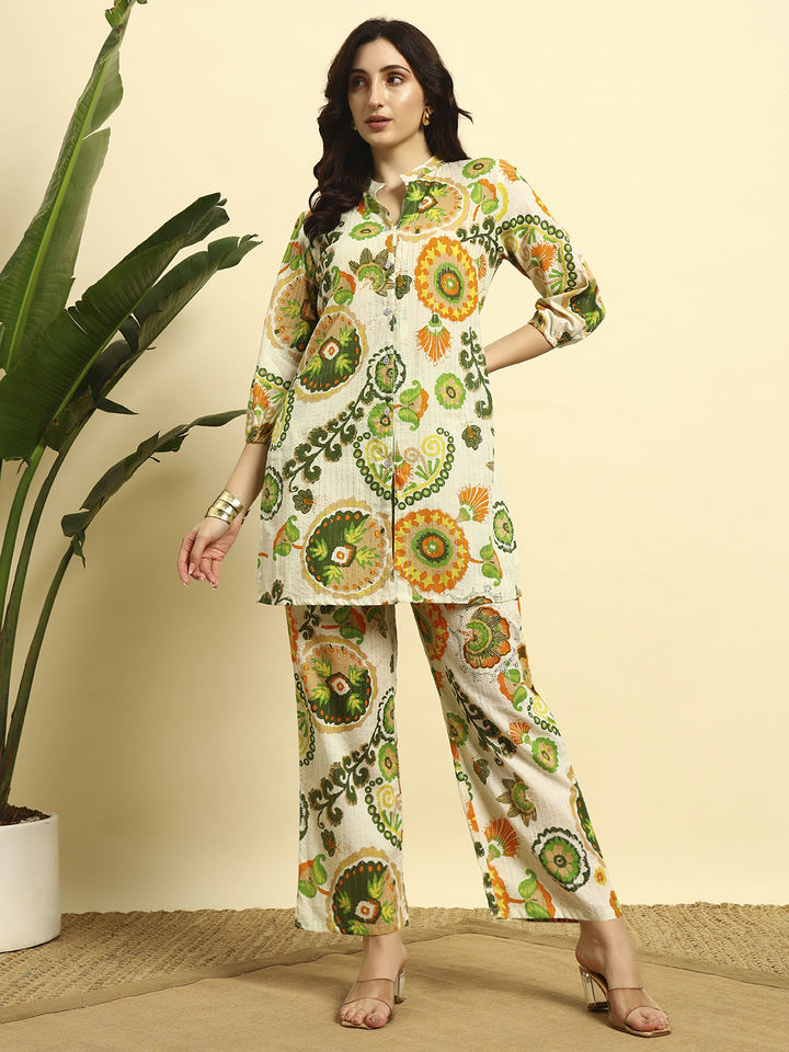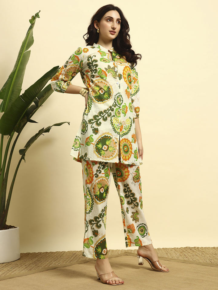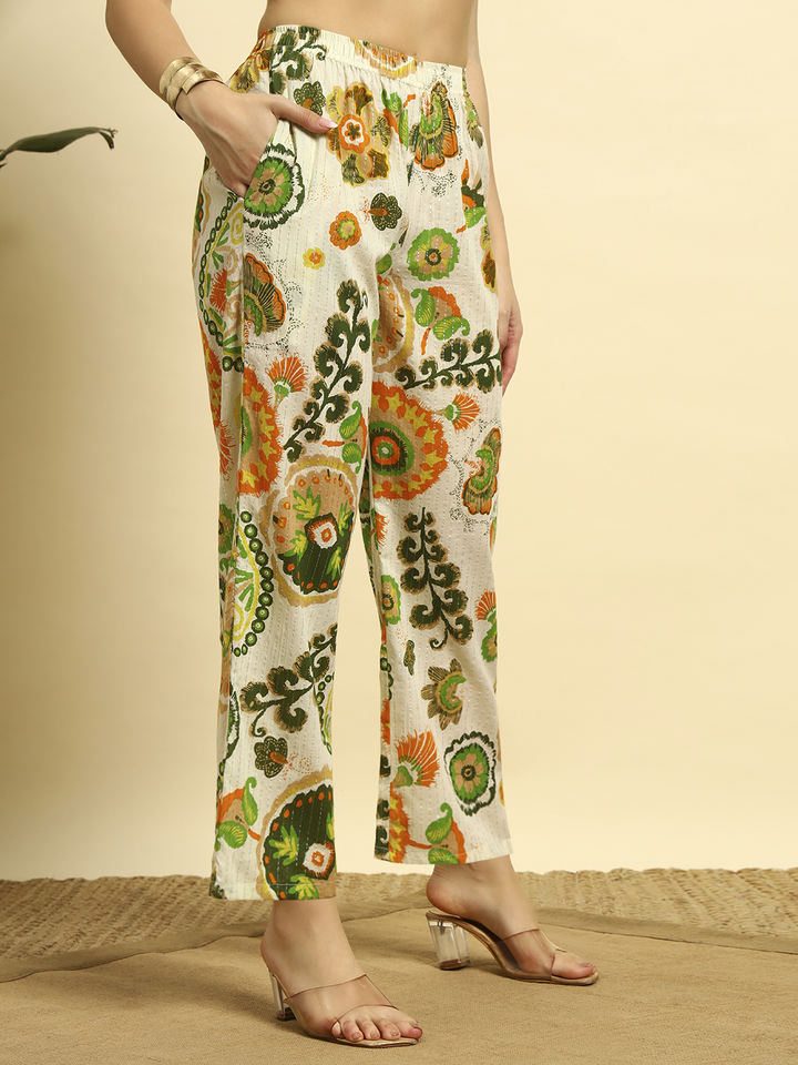 ชุดคุर्ติผ้าฝ้ายพรีเมียมลายดอกไม้สำหรับฤดูร้อนแบบผ่าข้างสั้น พร้อมกางเกงปาลาซโซสำหรับผู้หญิง | ผ้าที่ระบายอากาศได้ดี | ชุดลำลองและชุดพื้นเมือง