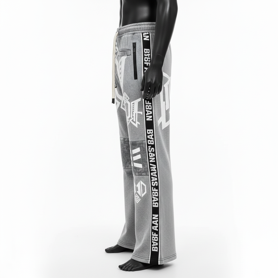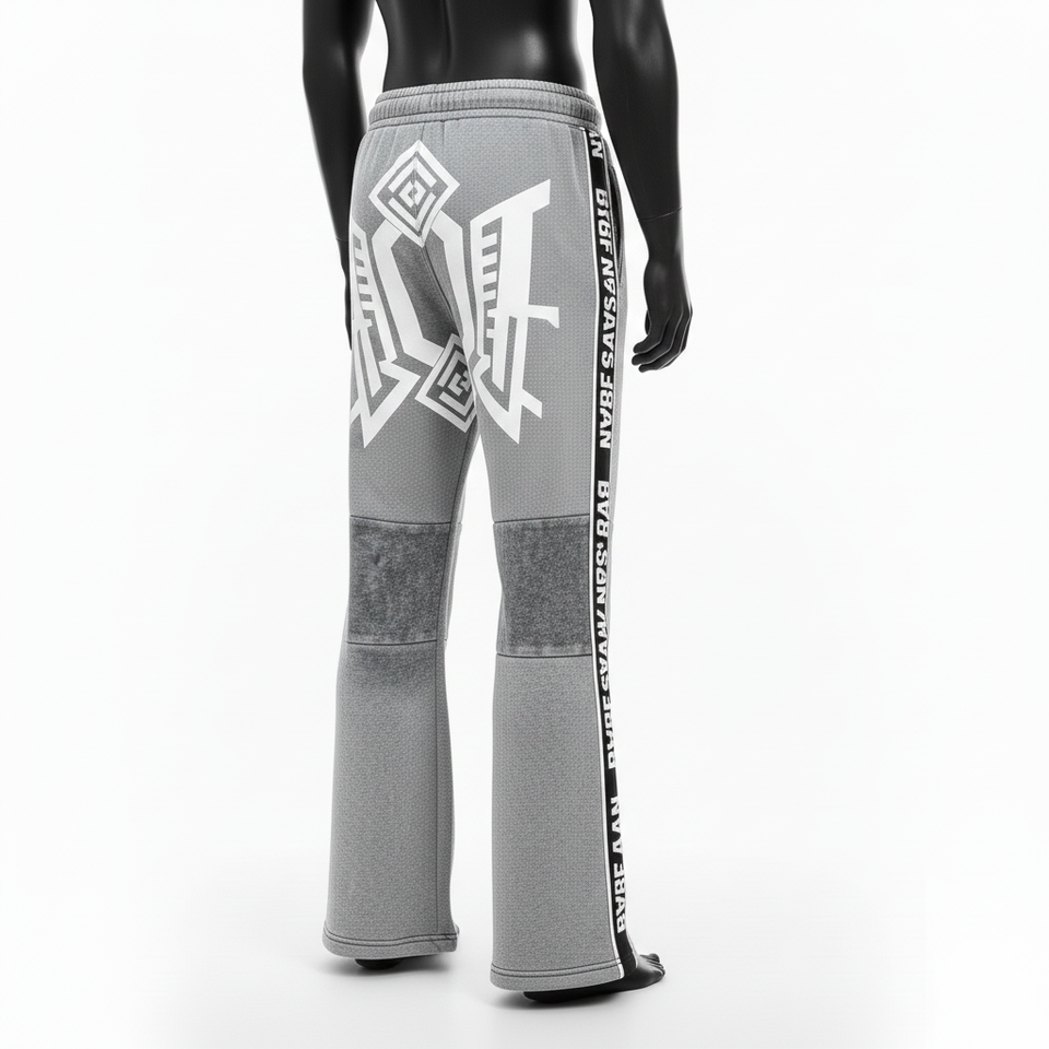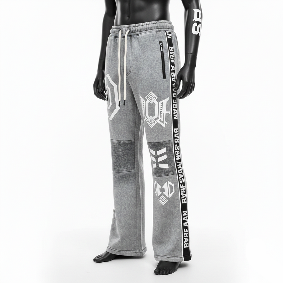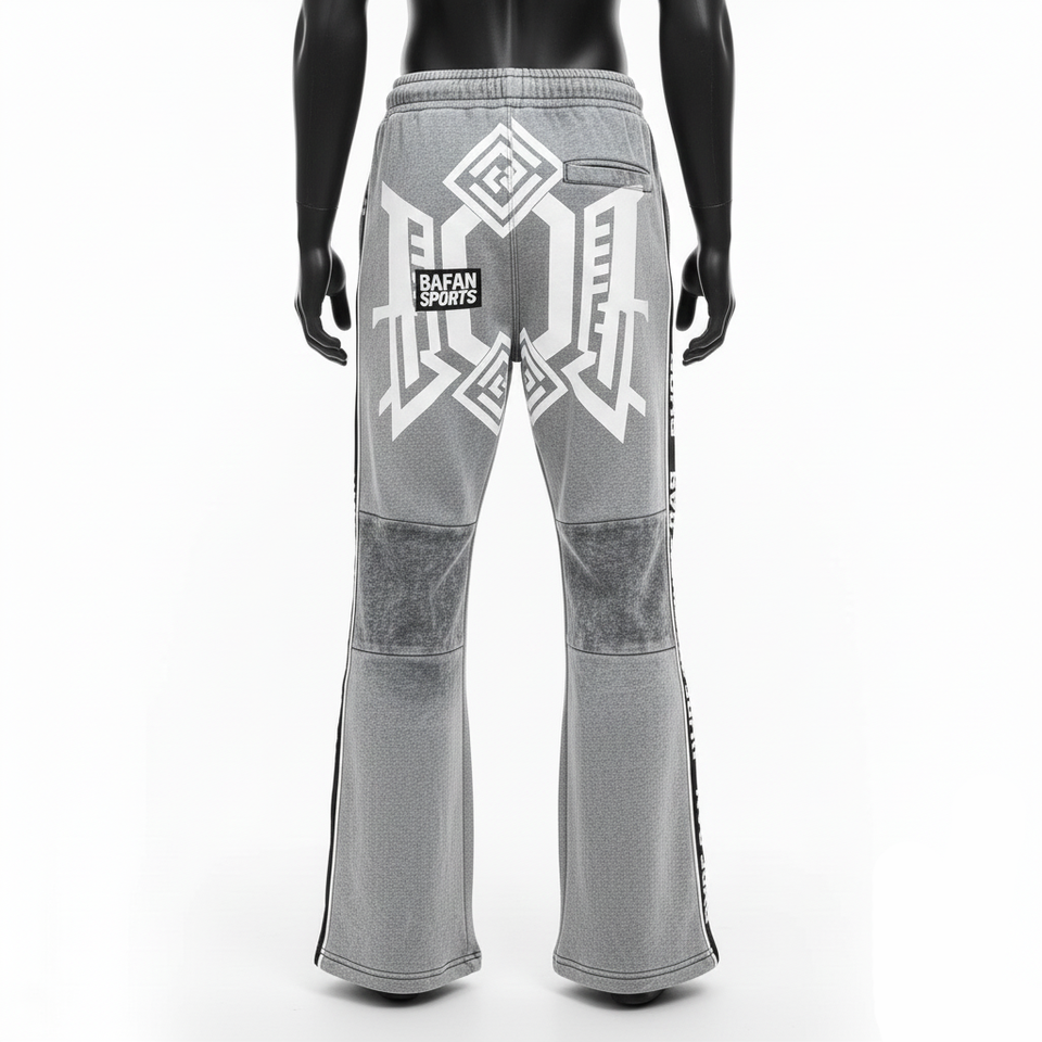 กางเกงฟลีซทรงบานผ้าฝ้ายผสมโพลีเอสเตอร์พรีเมียม สีเทา ดีไซน์แผงสี โลโก้แบบรีดร้อน ชุดกีฬาแบบกำหนดเอง กางเกงฟลีซทรงบานสำหรับผู้ชาย