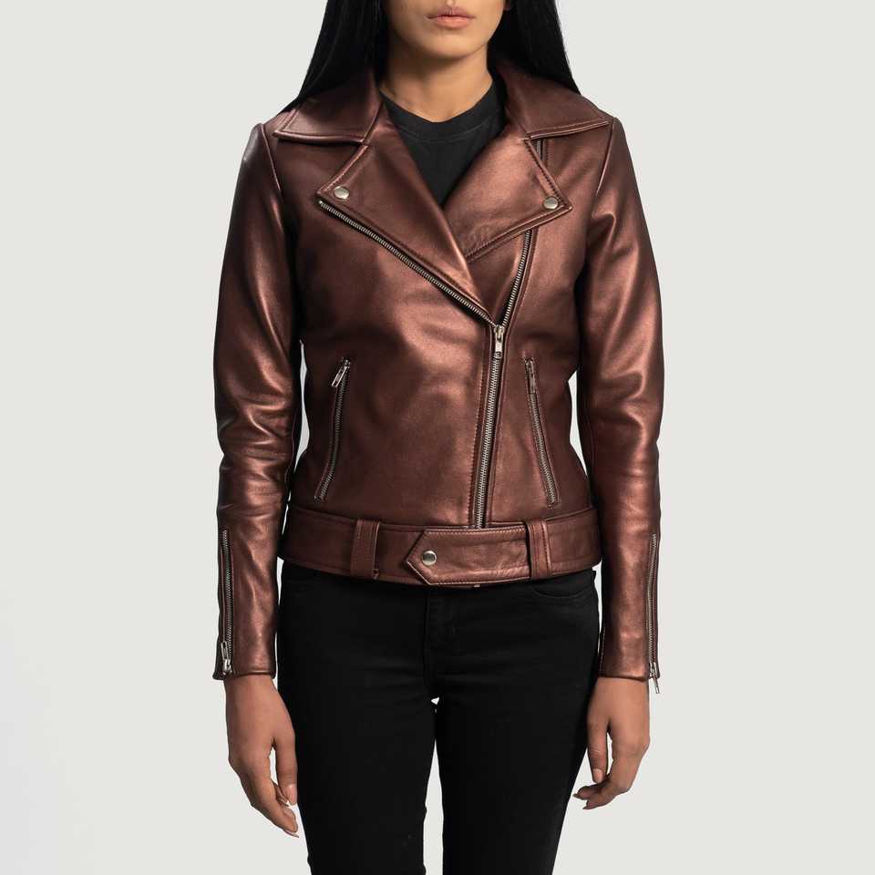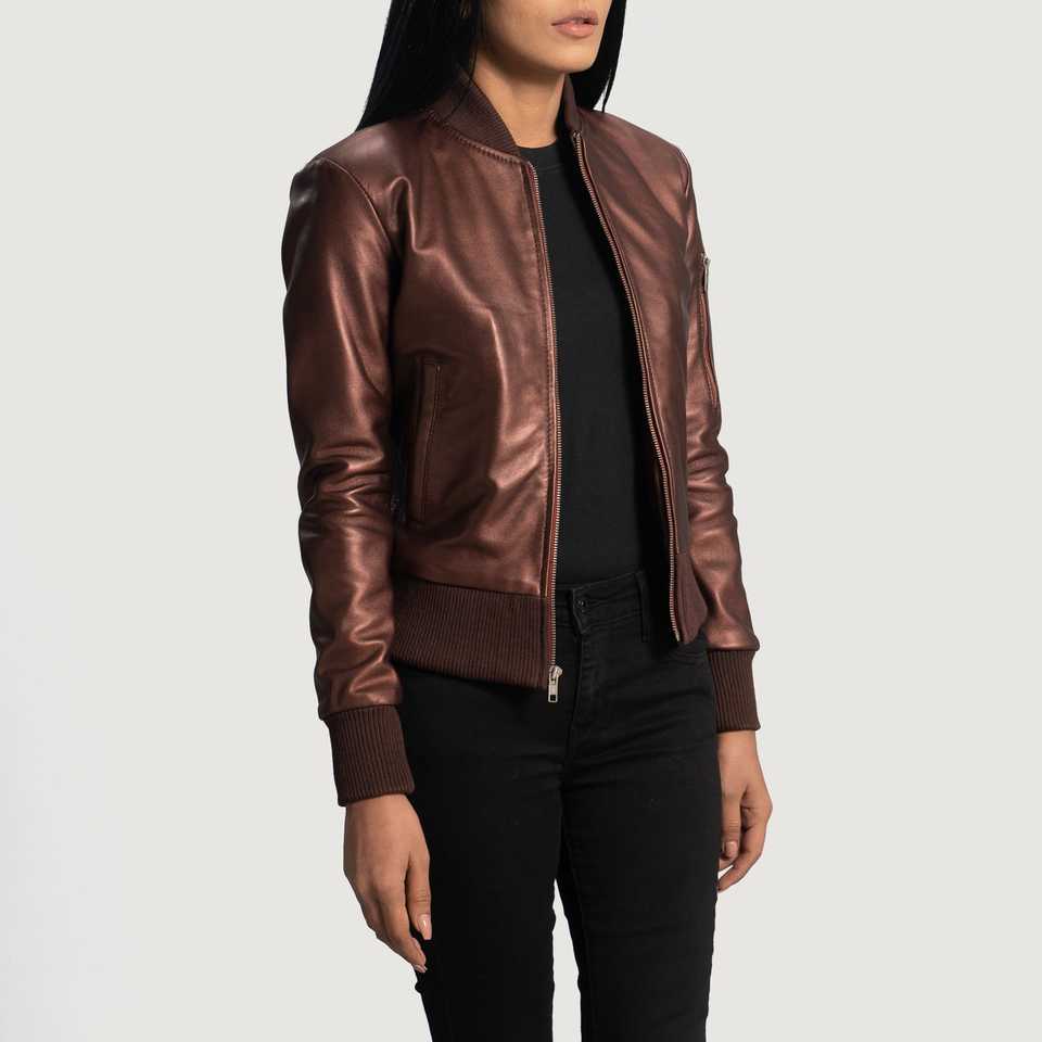 แจ็คเก็ตบอมเบอร์หนังวัวแท้พรีเมียมสำหรับผู้ชาย ลายตัวอักษร ซิปสีบรอนซ์ ทรงโมเดิร์น คอตั้ง โลโก้ด้านหน้า สไตล์เท่