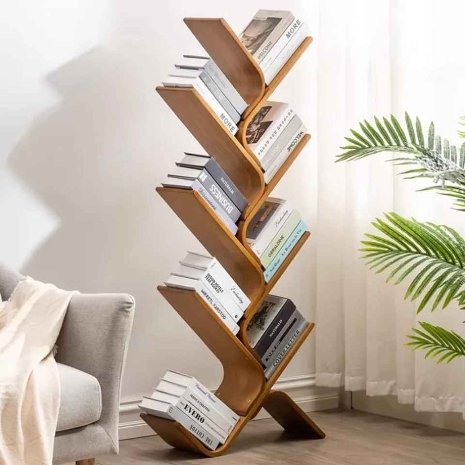 ชั้นวางหนังสือไม้ไผ่โค้งพรีเมียม 8 ชั้น ชั้นวางหนังสือแนวตั้งทันสมัย ชั้นวางของรูปตัว S ดีไซน์ไม่ซ้ำใคร สำหรับห้องนั่งเล่น