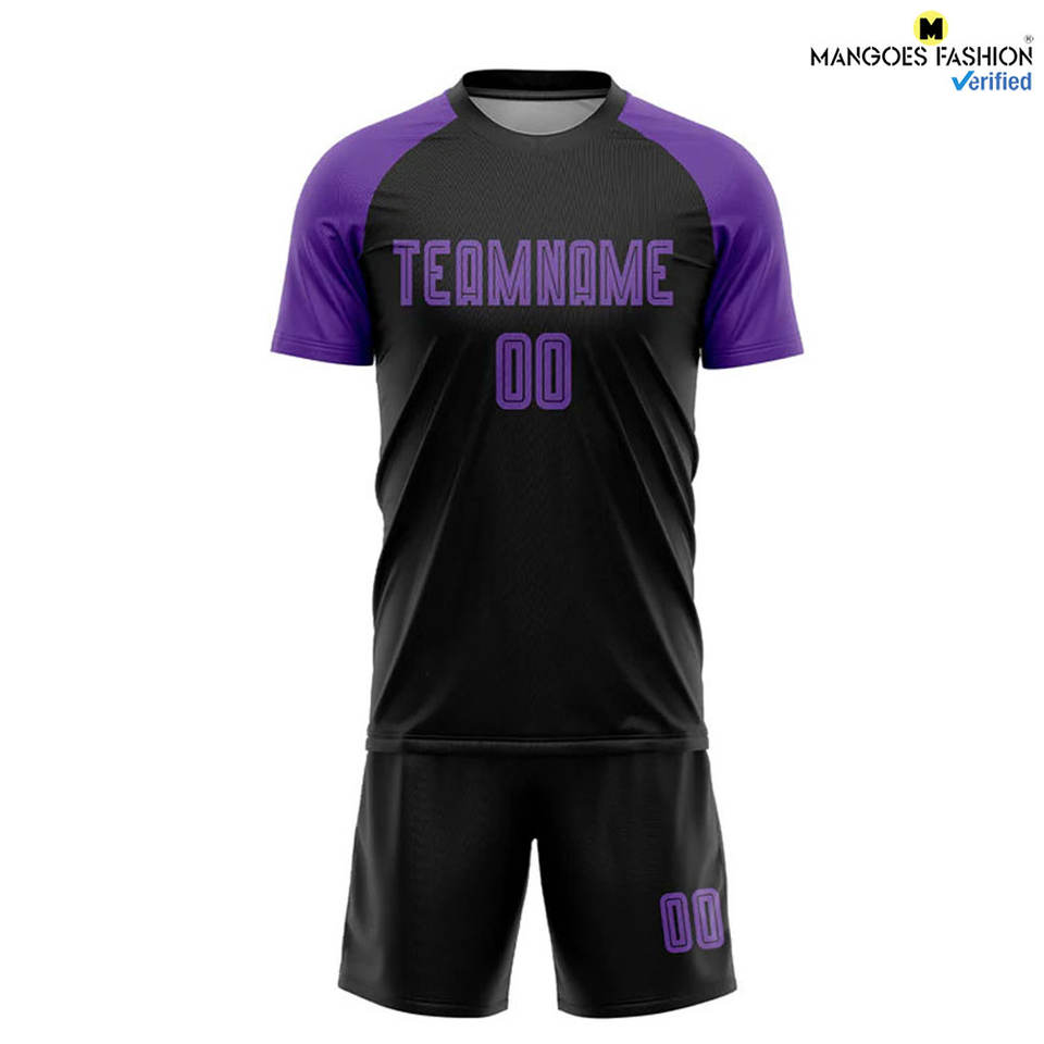 เสื้อฟุตบอลแบบซับลิเมชันสีดำสีม่วงผ้าโพลีเอสเตอร์แบบถักด้วยตาข่ายรูเข็มผ้าสแปนเด็กซ์