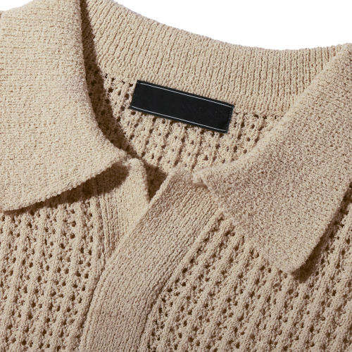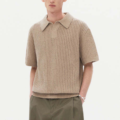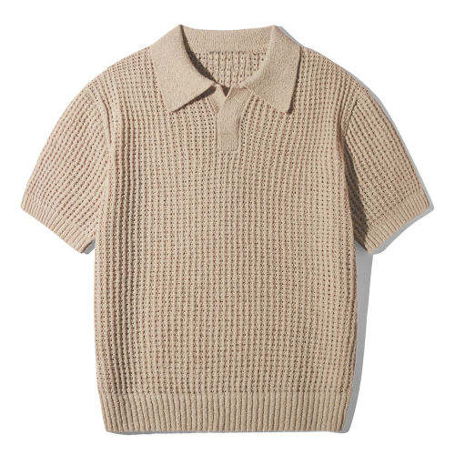 เสื้อสเวตเตอร์ถักแขนสั้นสำหรับผู้ชายเสื้อถักวาฟเฟิลแขนสั้นผ้าฝ้ายสีทึบออกแบบได้ตามต้องการ