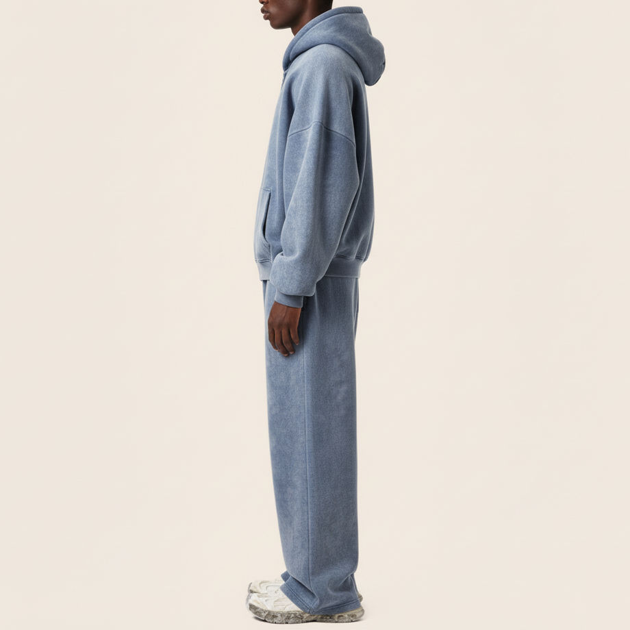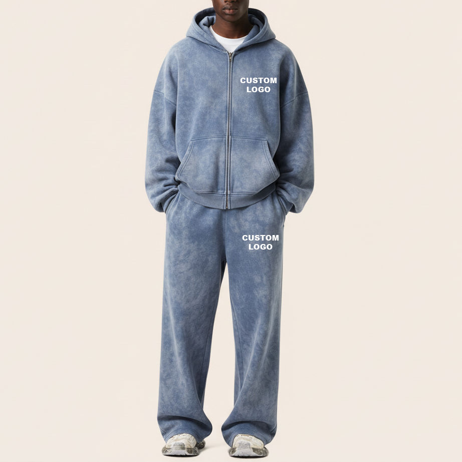 ชุดวอร์มผู้ชายพรีเมียมแบบวินเทจ ล้างสีด้วยกรด พิมพ์ลายโลโก้ด้วยเทคนิคซิลค์สกรีน สีซีดจางแบบซันเฟด น้ำหนักปานกลาง ผ้าฝ้าย 100%