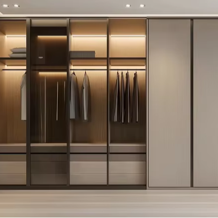 ตู้เสื้อผ้าแบบวอล์กอินสุดหรู ดีไซน์ทันสมัย พร้อมฉากกั้นกระจก ไฟ LED เหมาะสำหรับห้องนอน อพาร์ทเมนต์ บ้านพักตากอากาศ