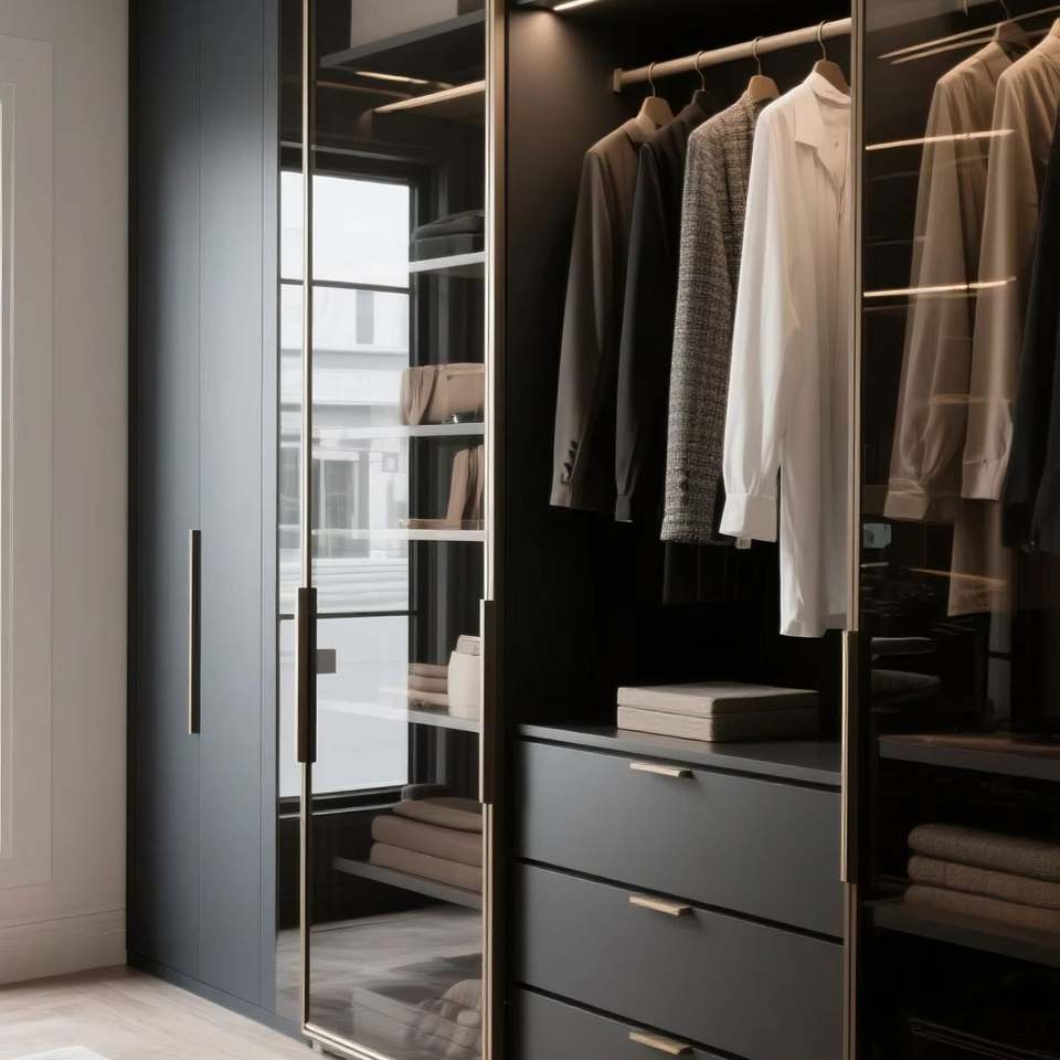 ตู้เสื้อผ้าแบบวอล์กอินสุดหรู ดีไซน์ทันสมัย พร้อมฉากกั้นกระจก ไฟ LED ในตัว เหมาะสำหรับอพาร์ทเมนต์ วิลล่า และบ้านพักอาศัย