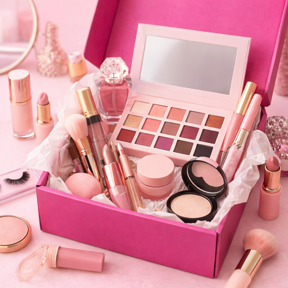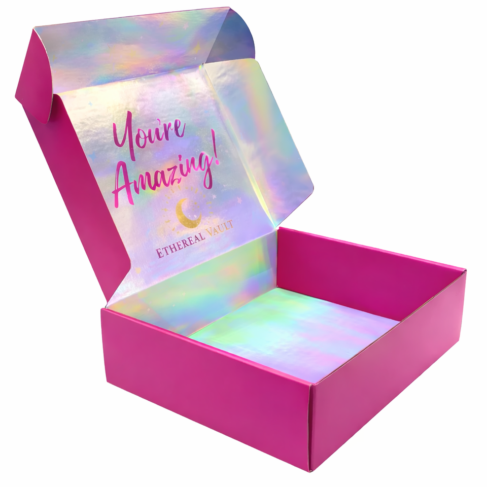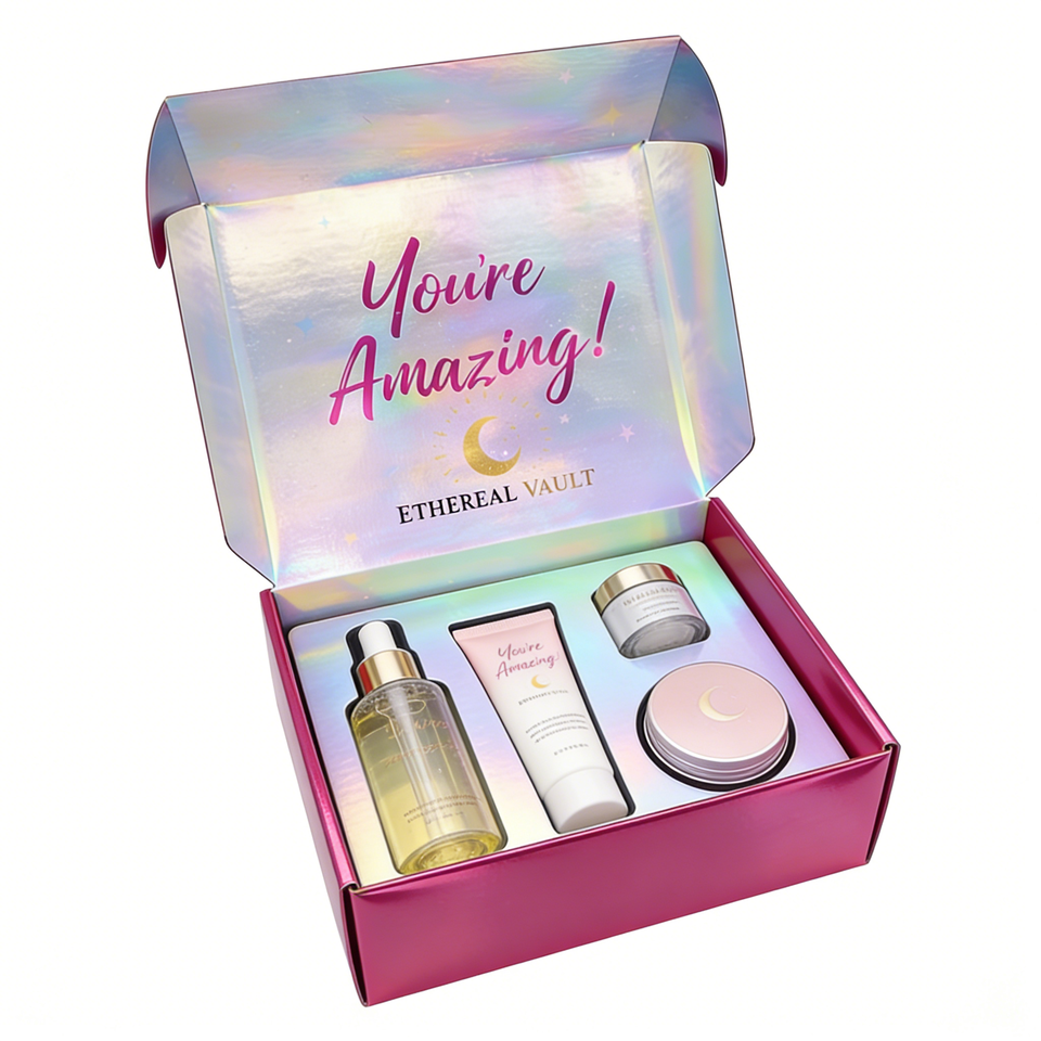 กล่องไปรษณีย์บรรจุภัณฑ์เครื่องสำอางแบบพรีเมียมสั่งทำพิเศษ ทำจากกระดาษลูกฟูก รีไซเคิลได้ พิมพ์สี่สี พร้อมเอฟเฟกต์เลเซอร์โฮโลแกรม สำหรับชุดผลิตภัณฑ์ความงาม